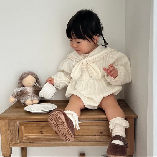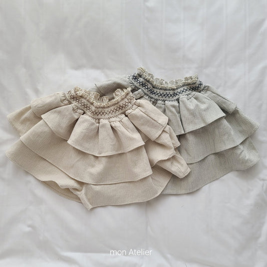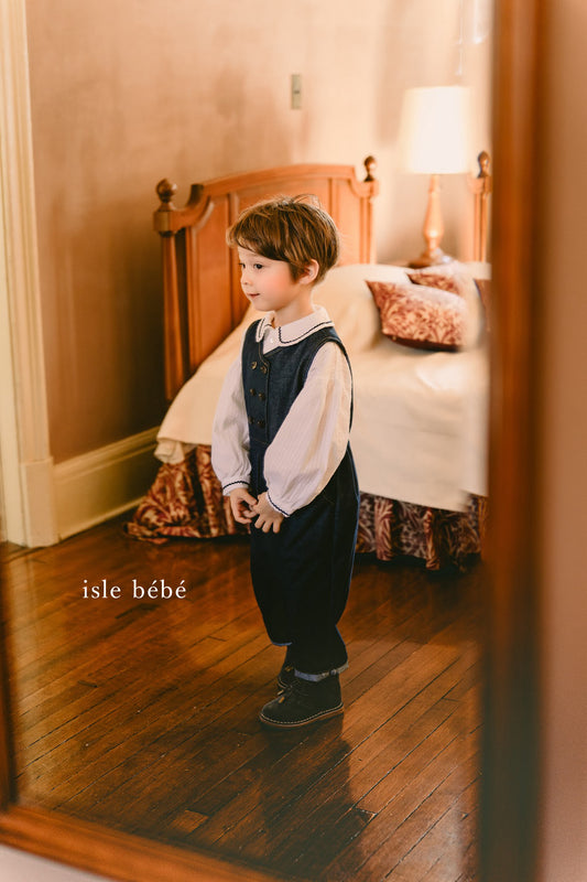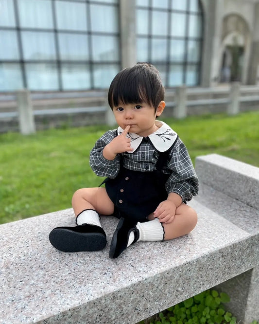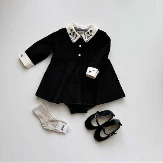 Popelin / Black velvet romper suit with skirt, embroidered collar and placket