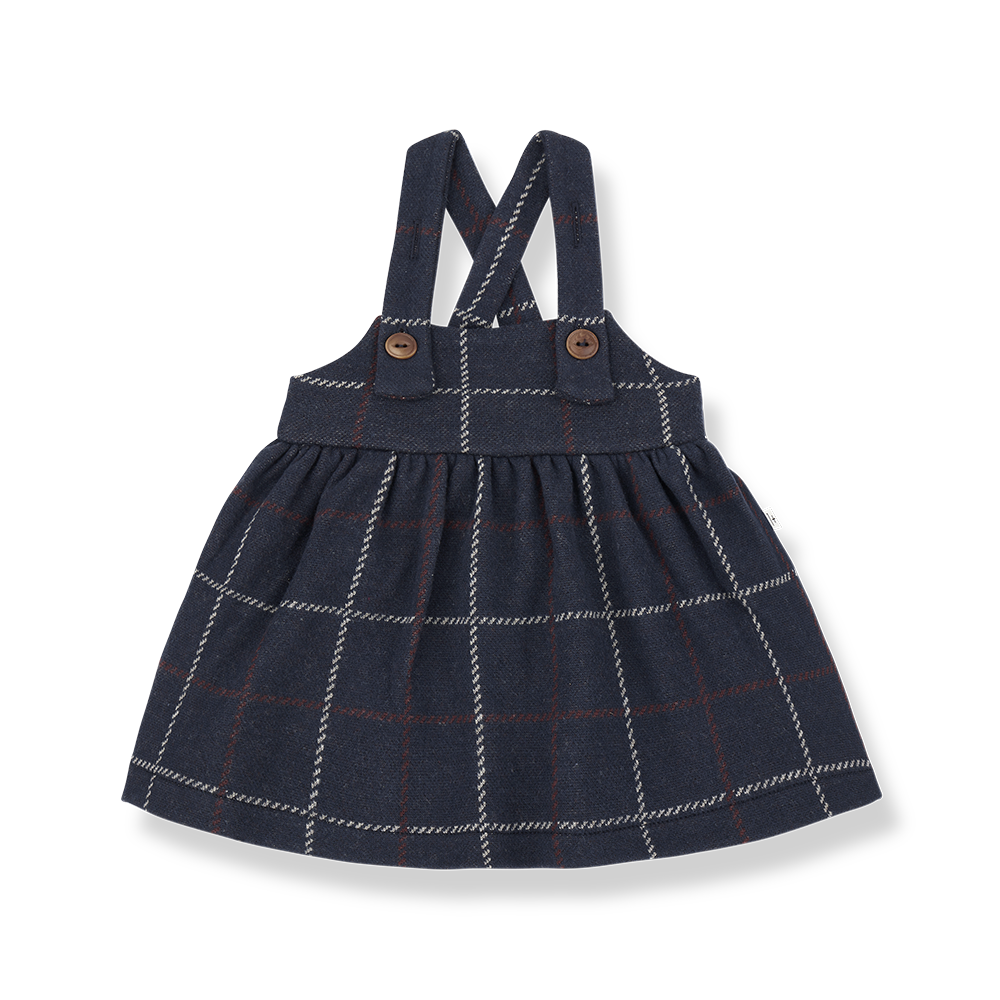 コントラストのあるウッドボタンが上品にまとまったサスペンダーワンピース。