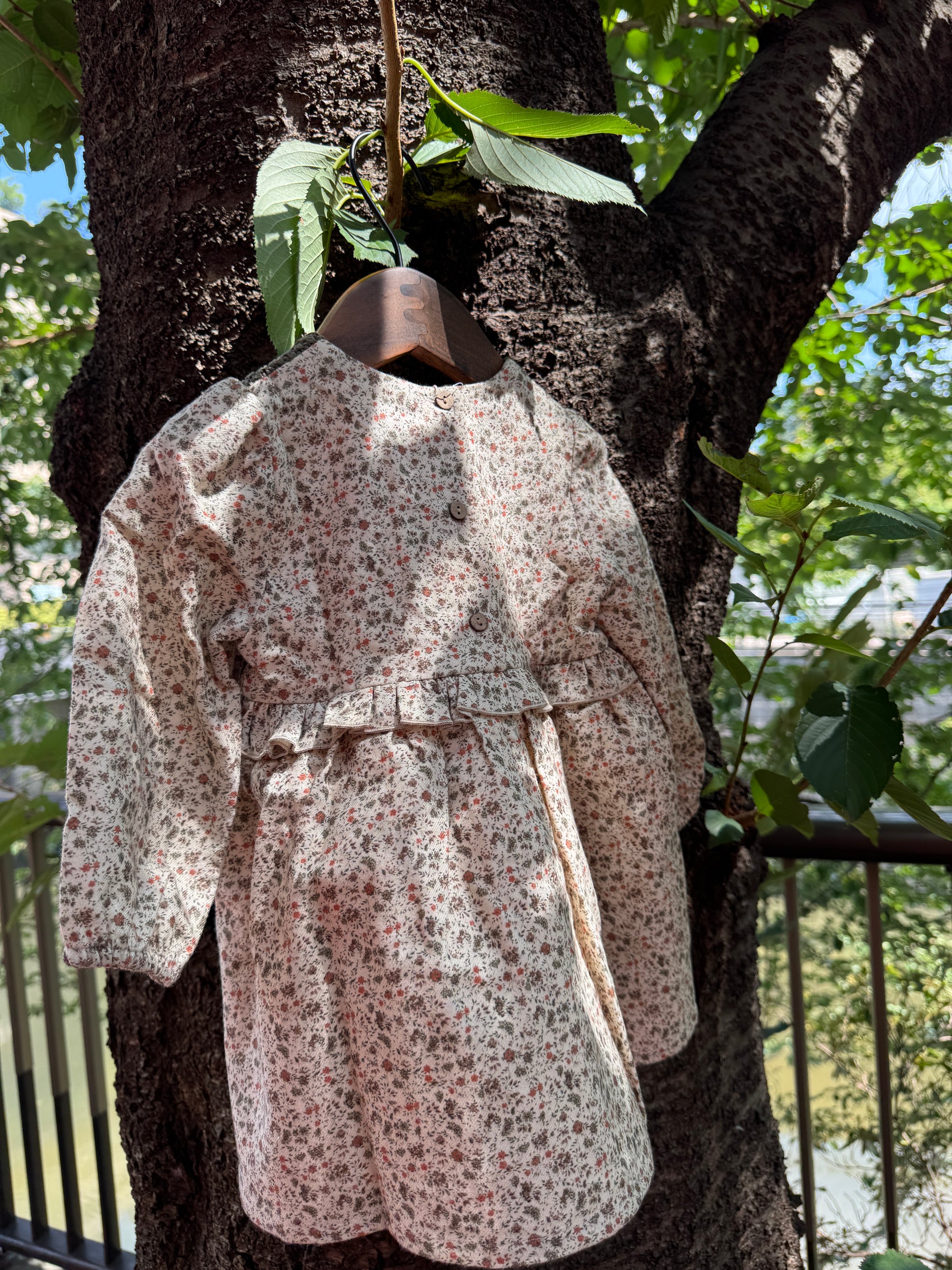 袖口はゴム仕様の長袖。ウエストはフリルがあしらわれております。
