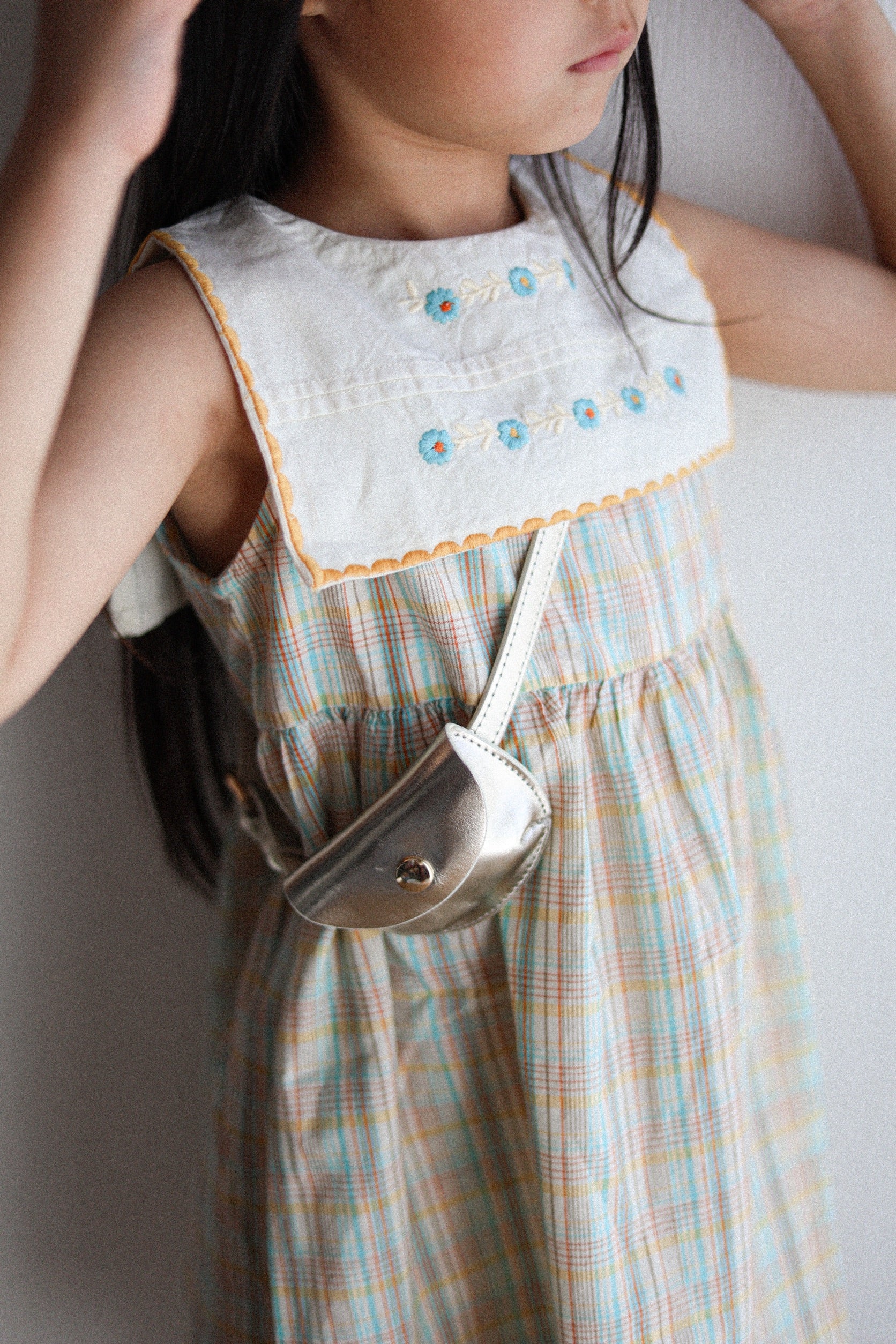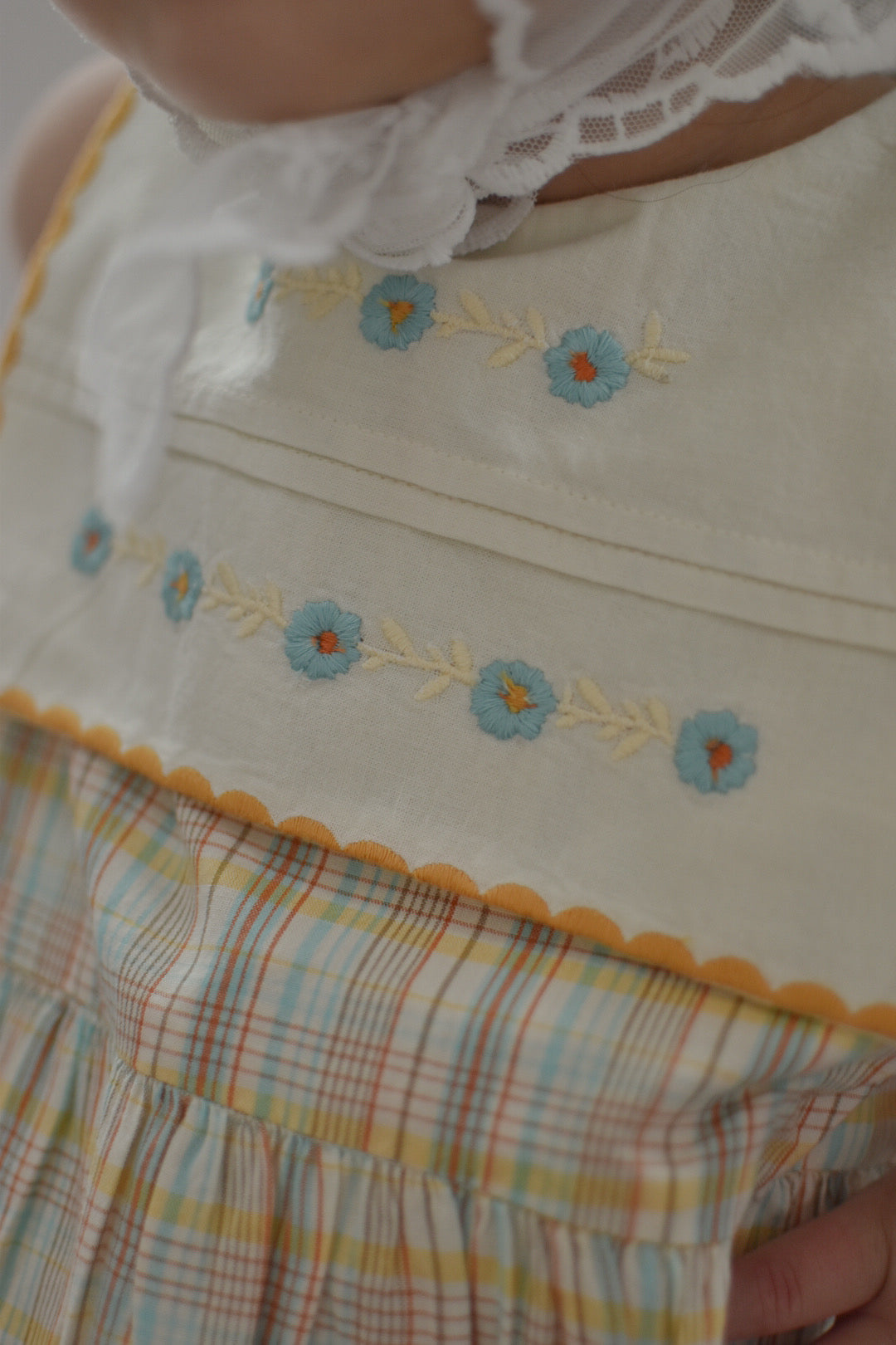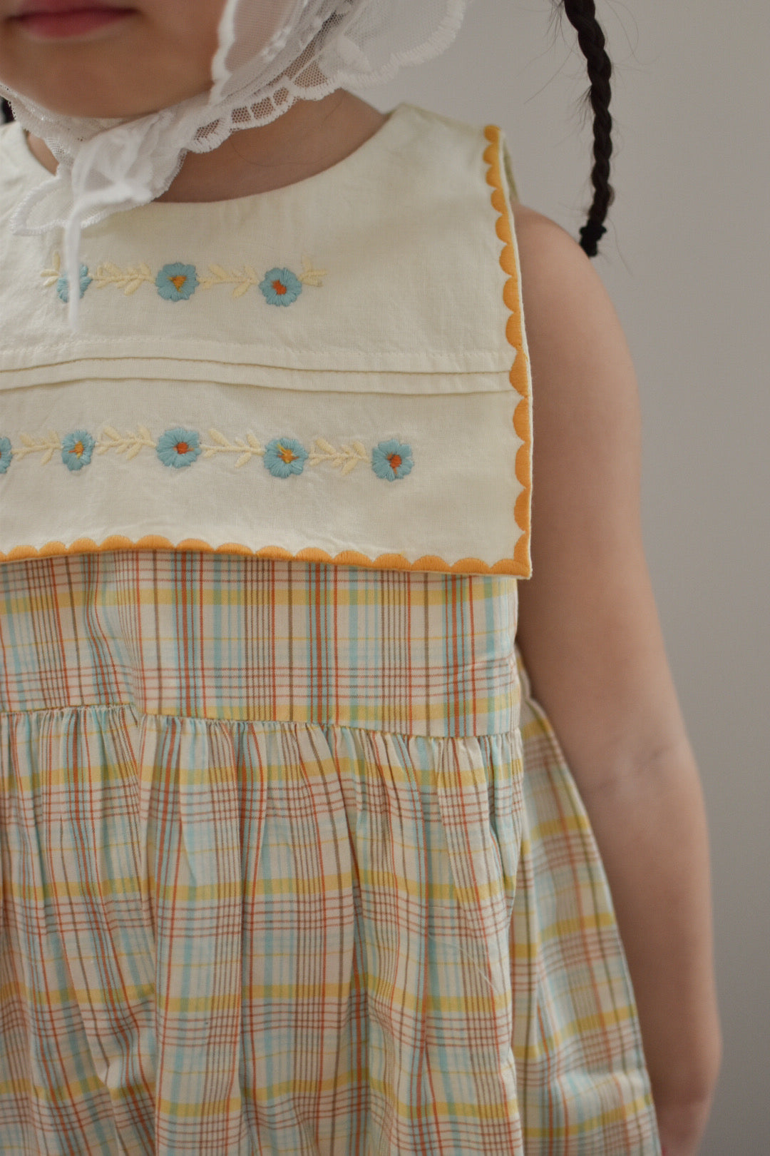 シグネチャーカラーであるスカイブルーのフローラル刺繍が施された