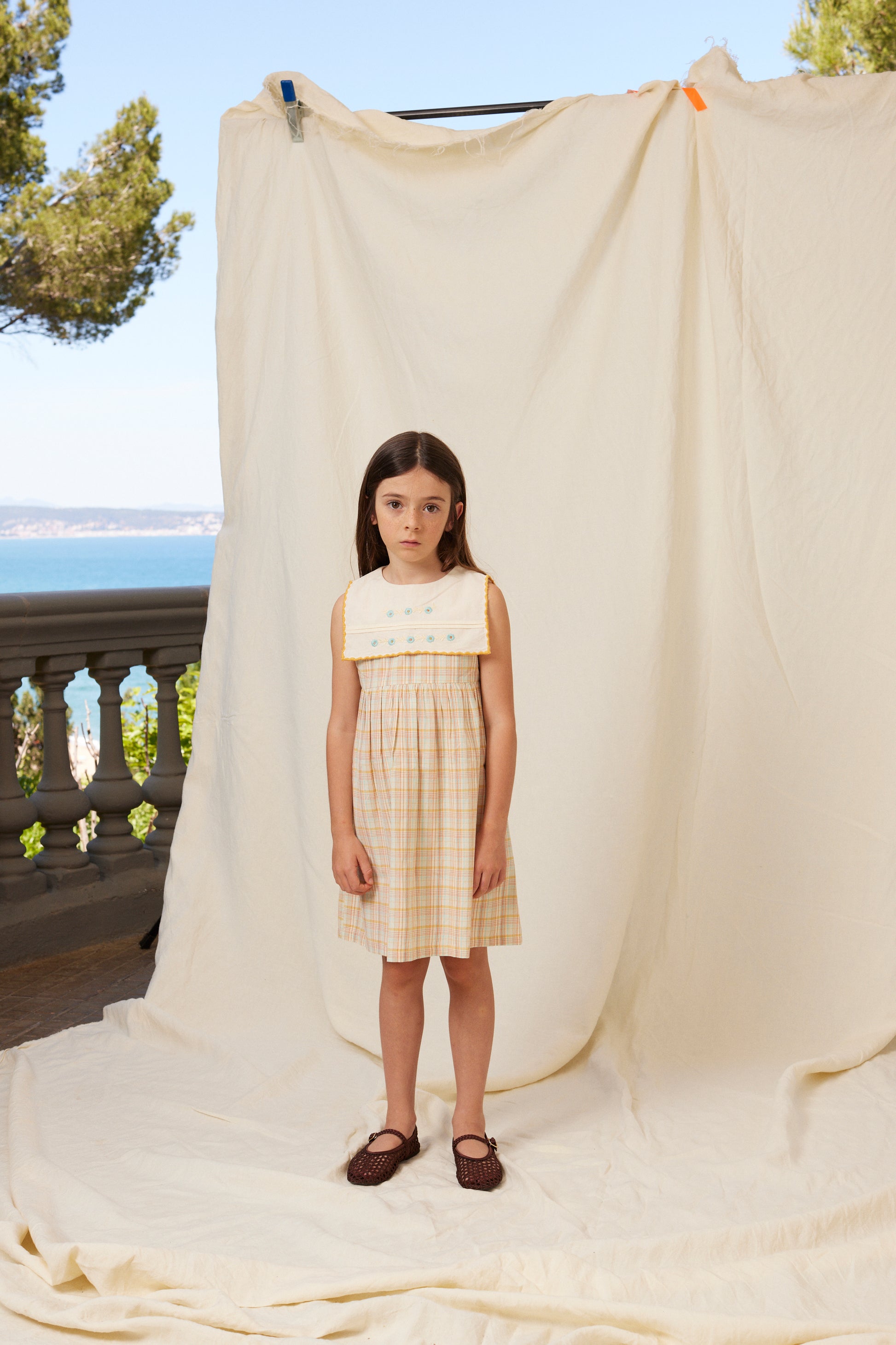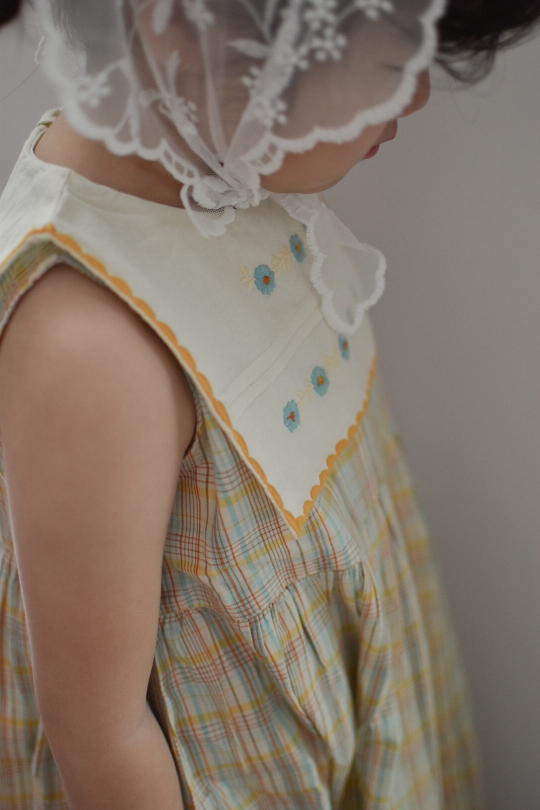 キュートなスクエアカラーとノースリーブデザインが特徴。