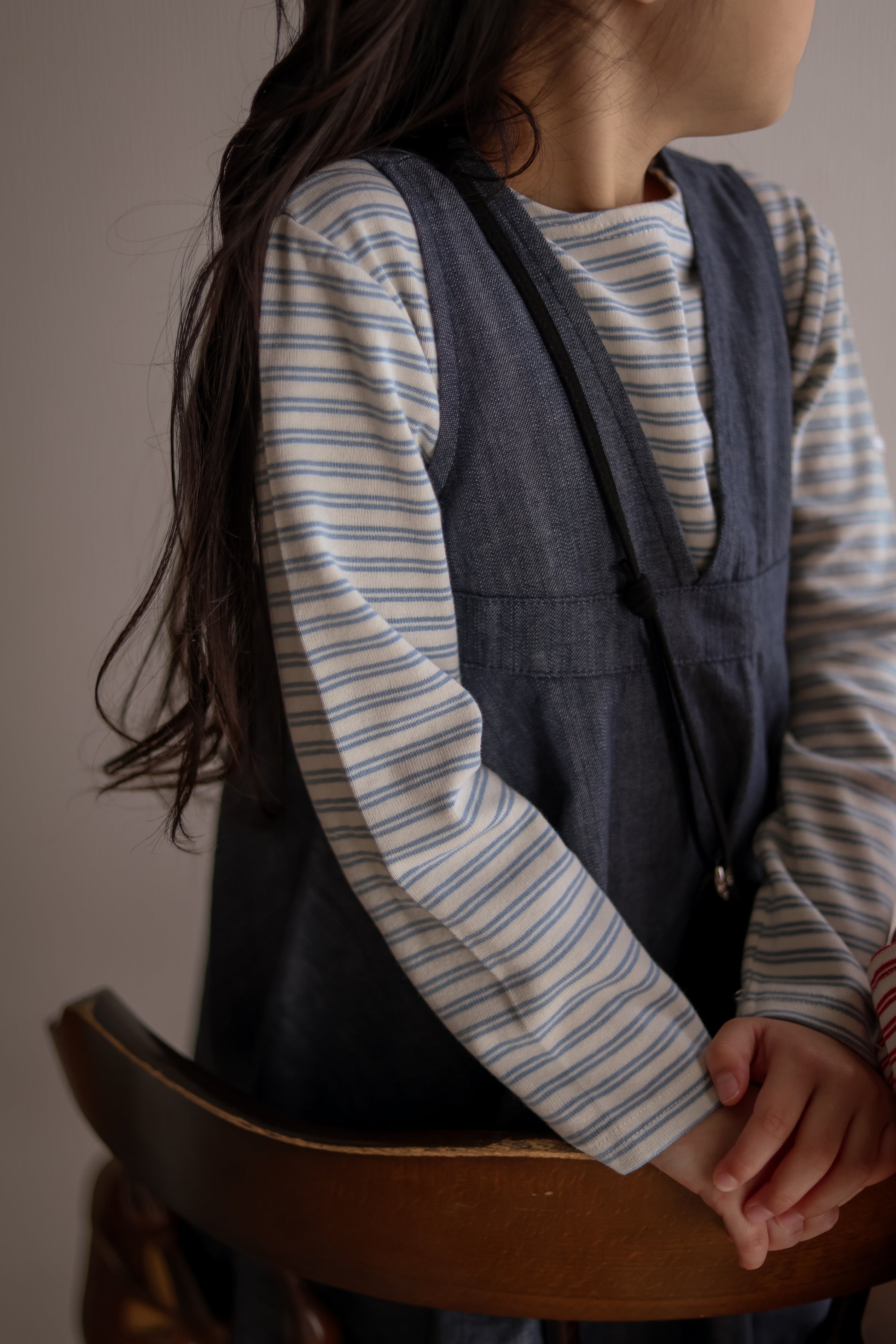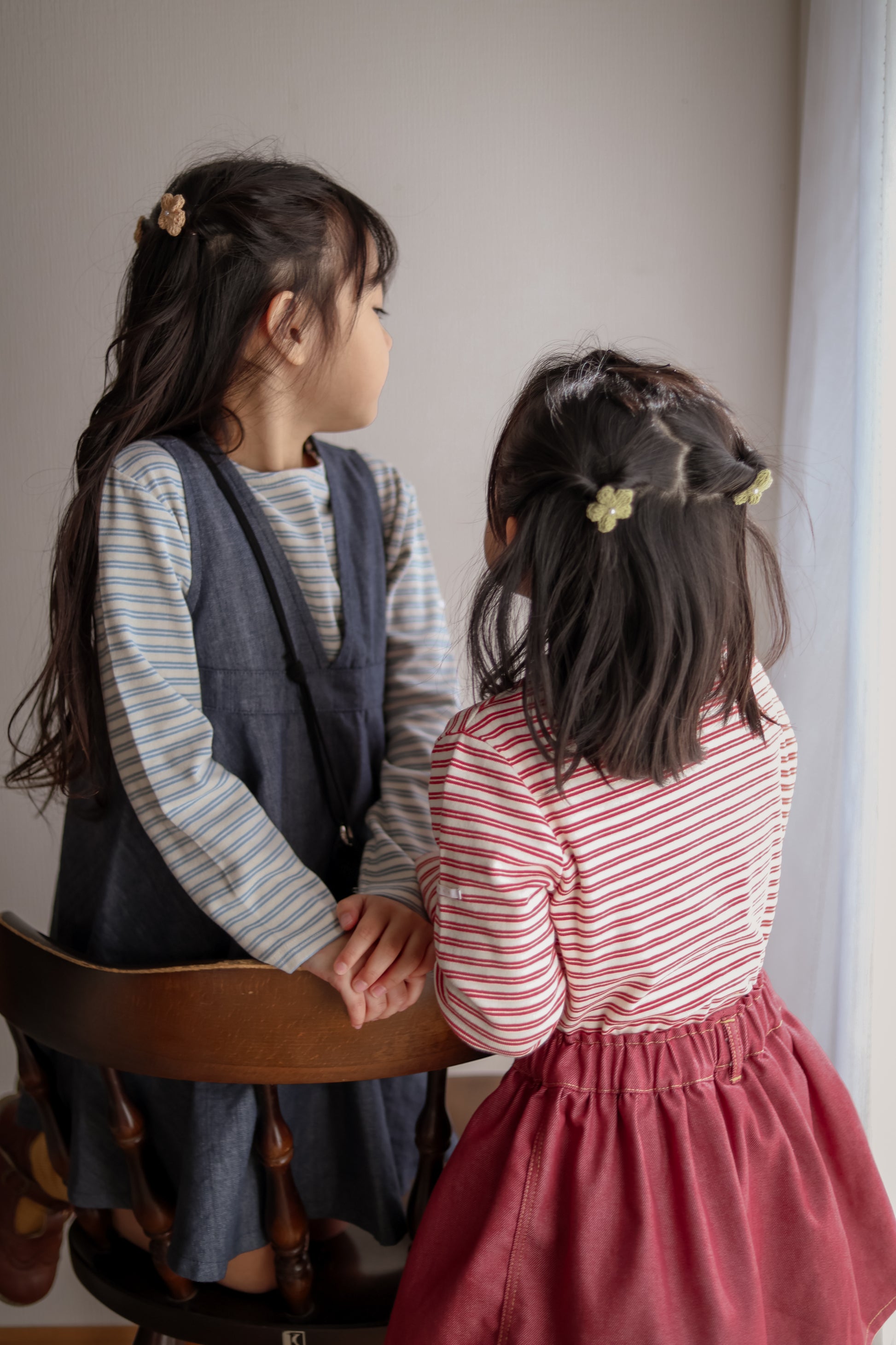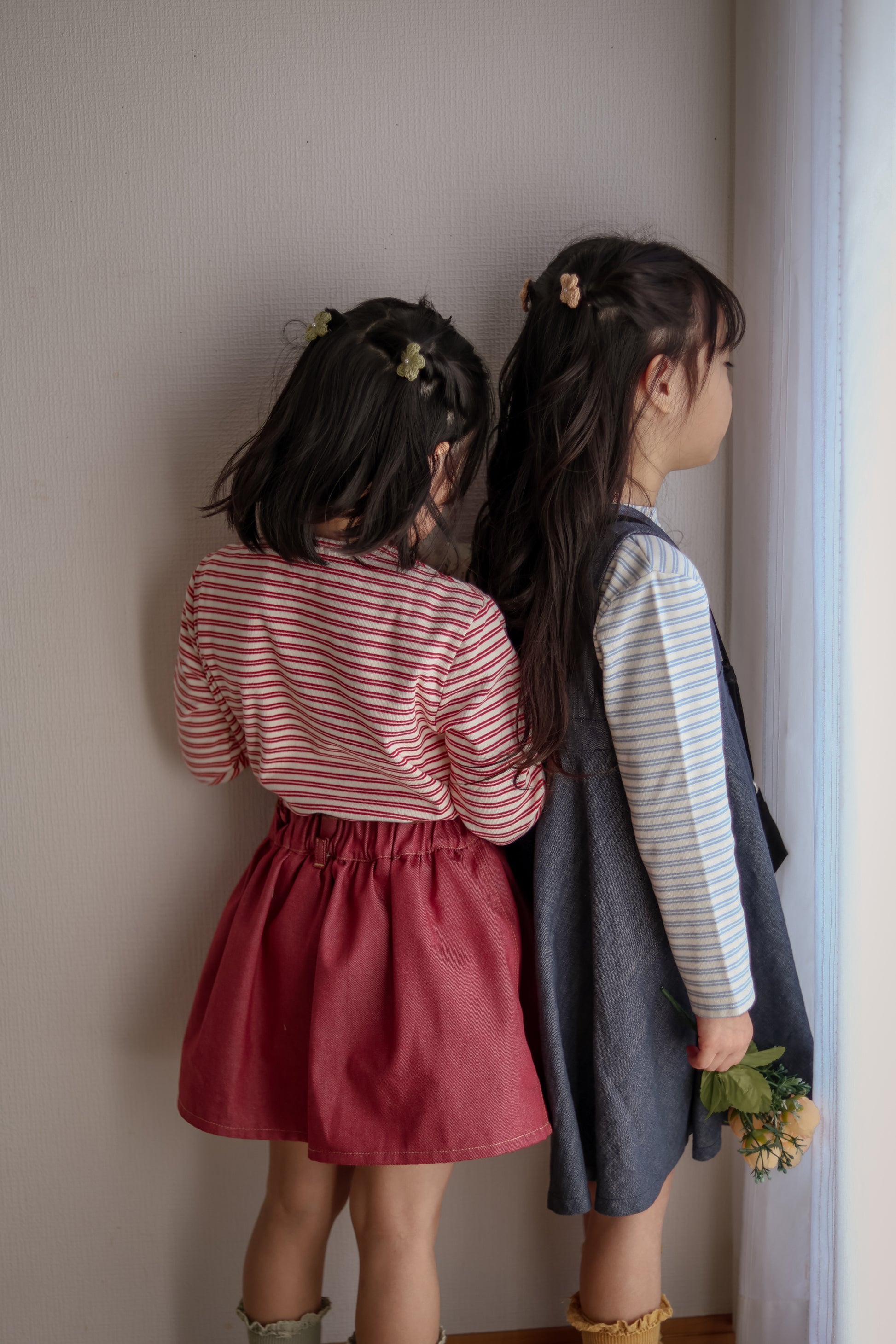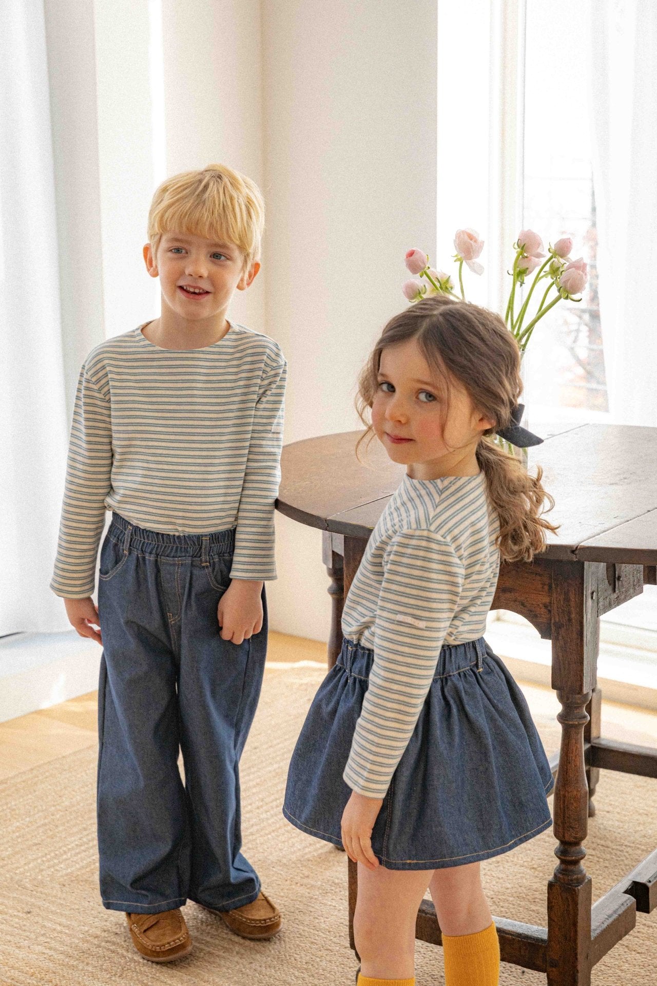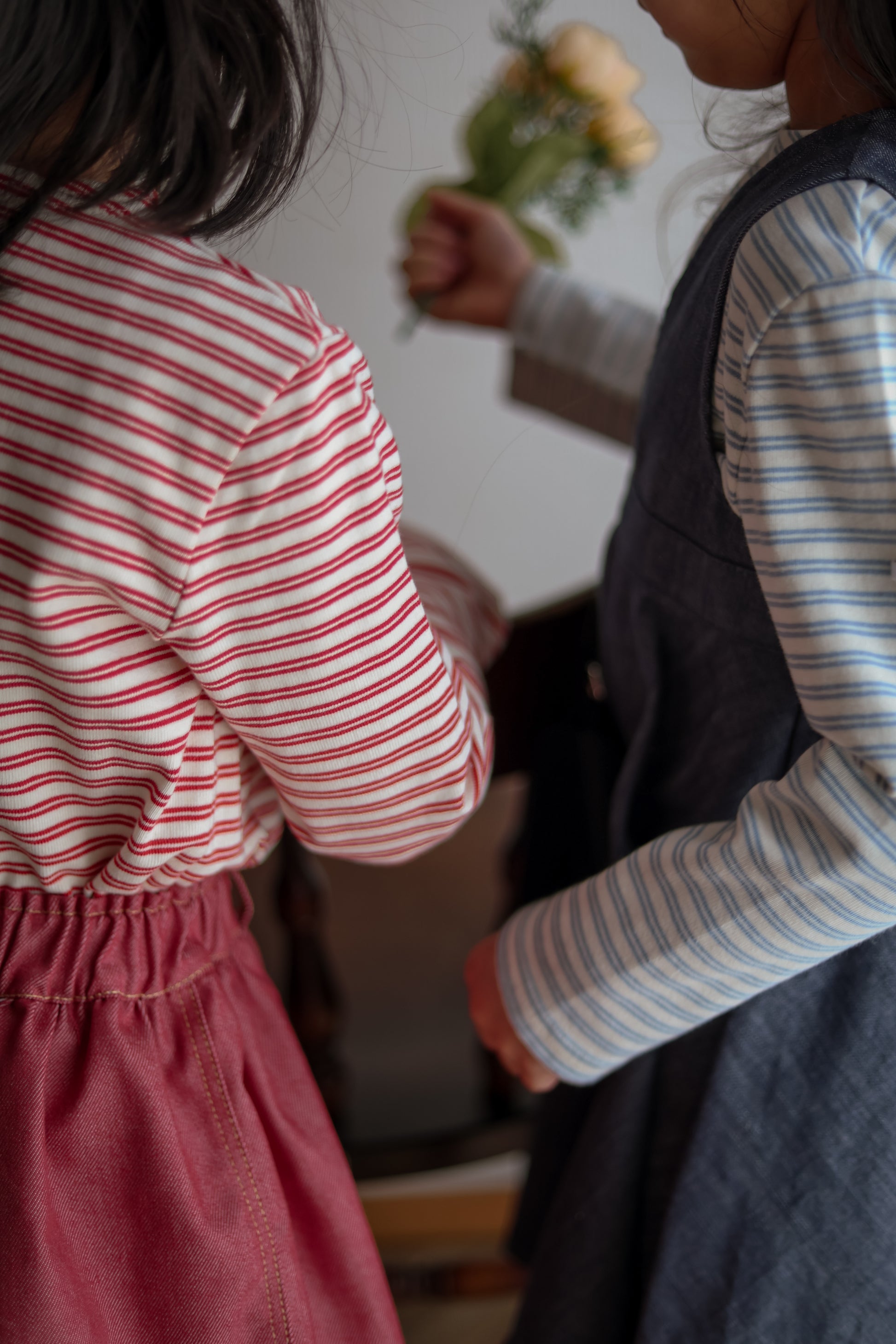 兄妹リンクも可能な、カジュアルすぎないクルーネックのシンプルストライプTシャツ。