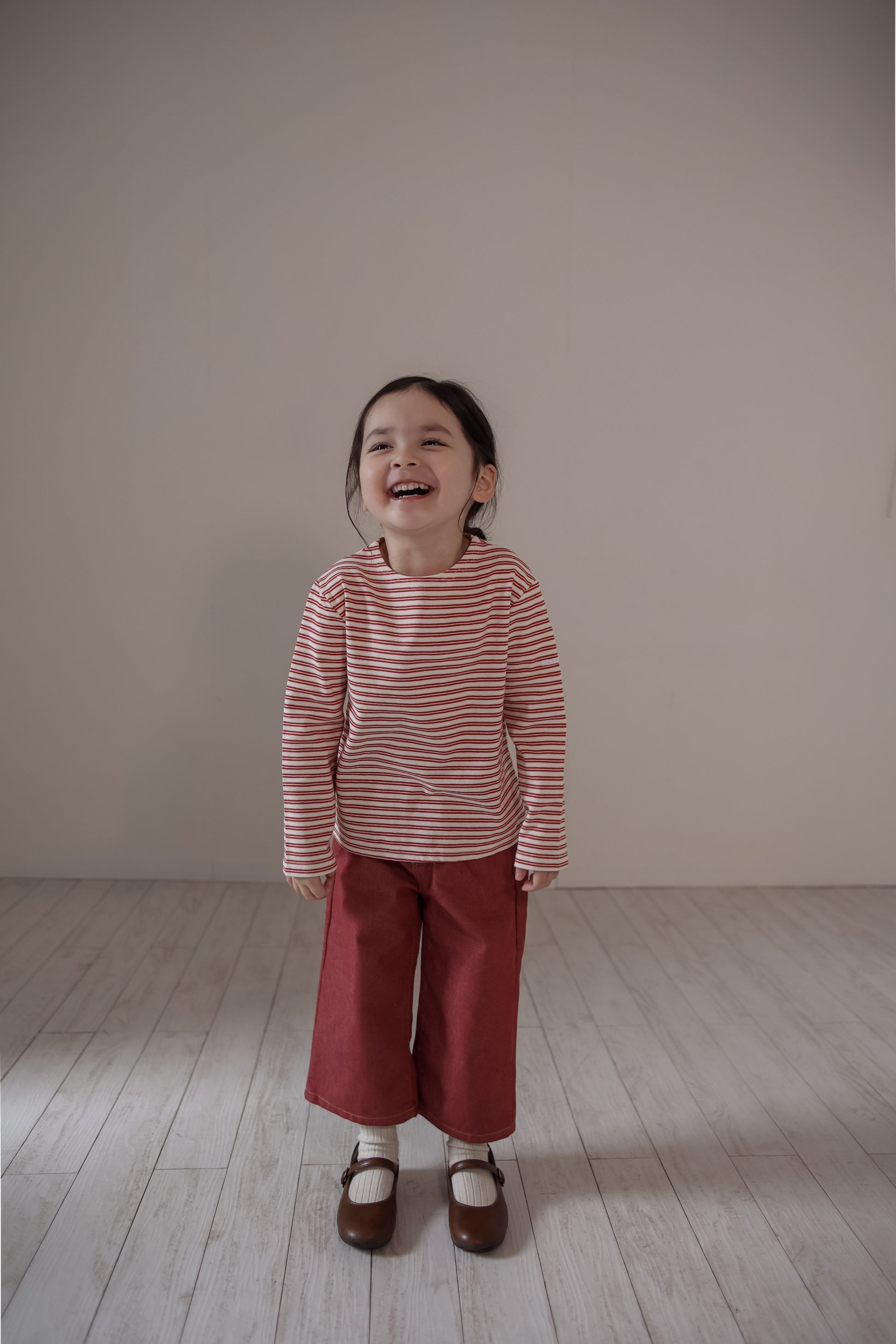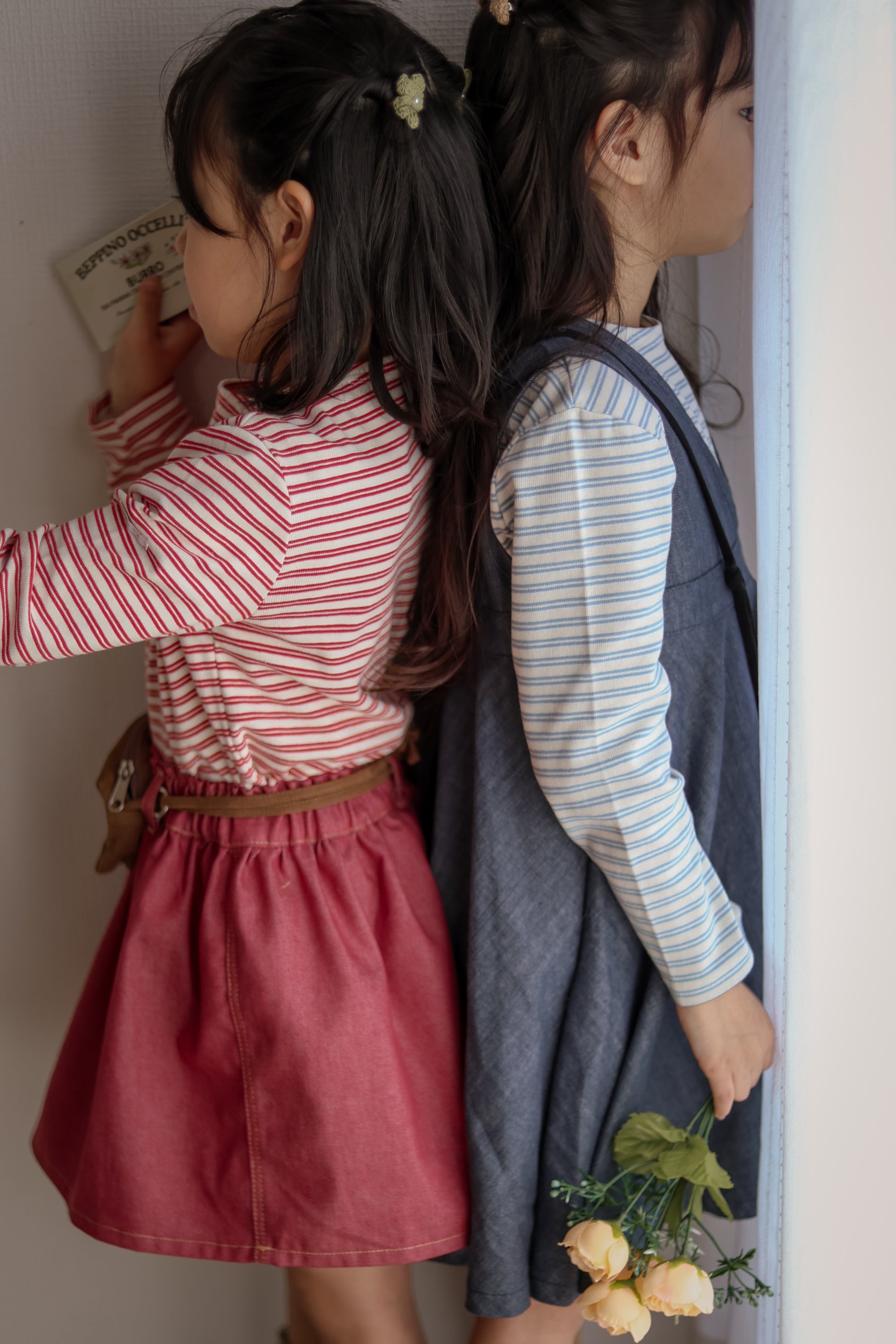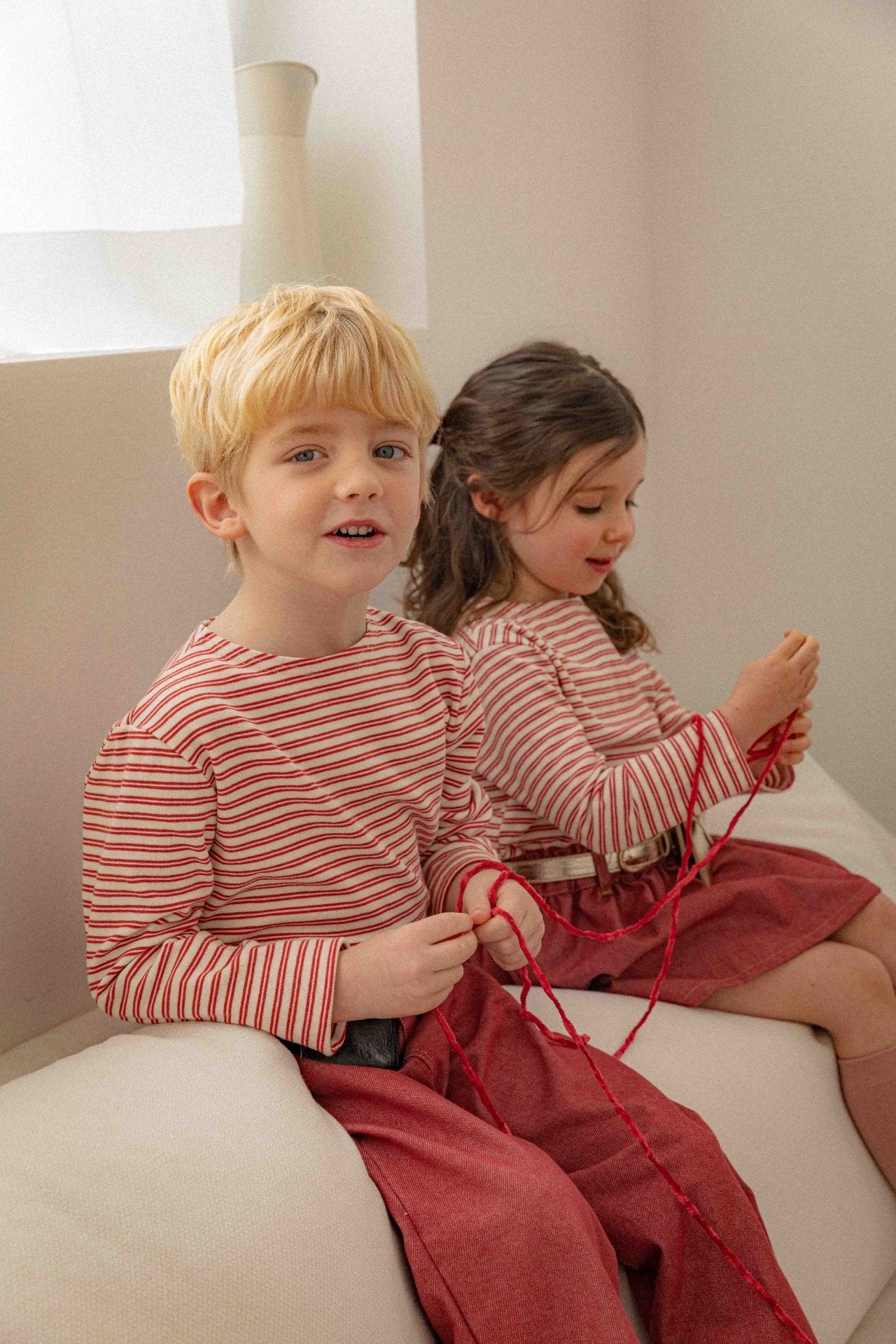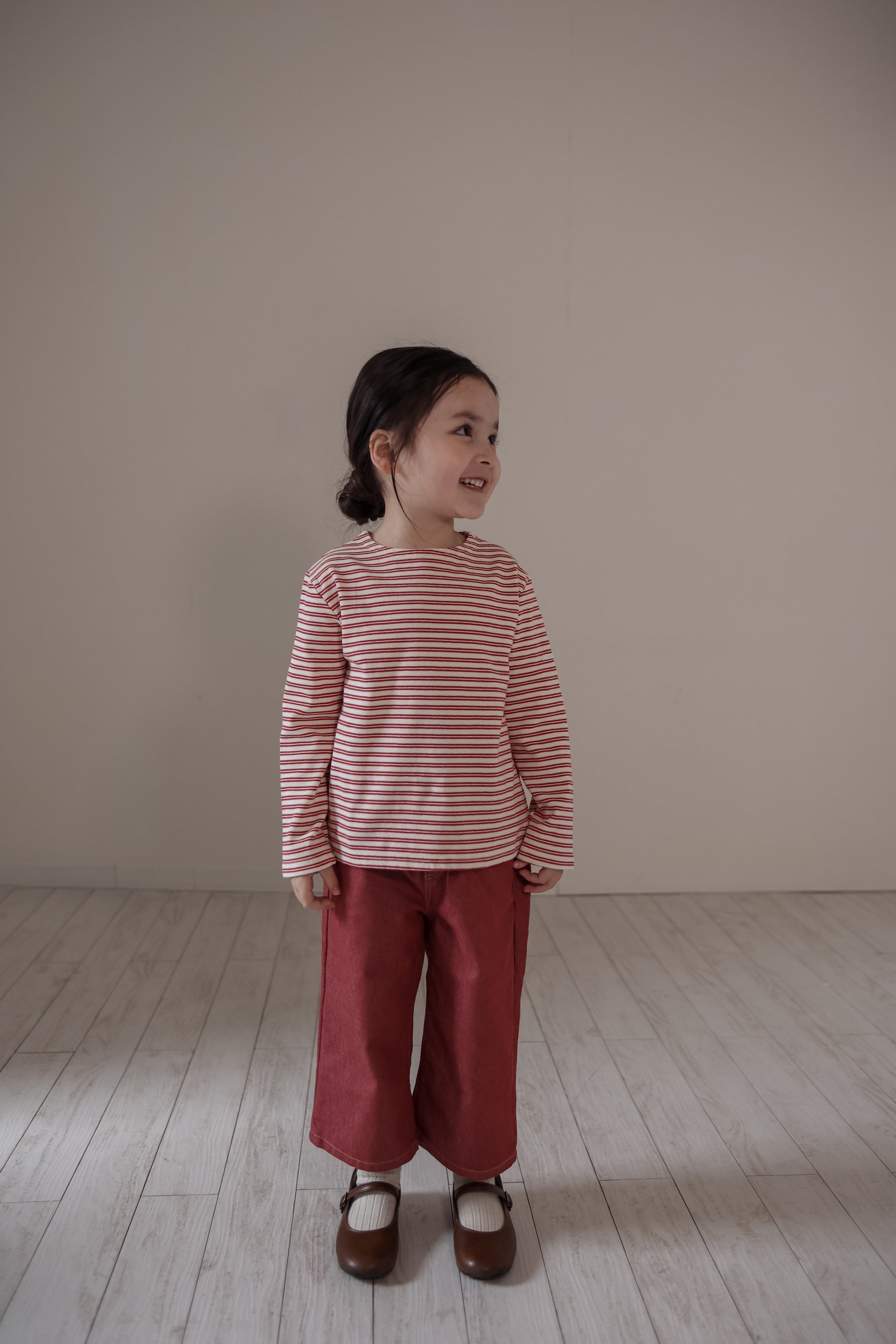 兄妹リンクも可能な、カジュアルすぎないクルーネックのシンプルストライプTシャツ。