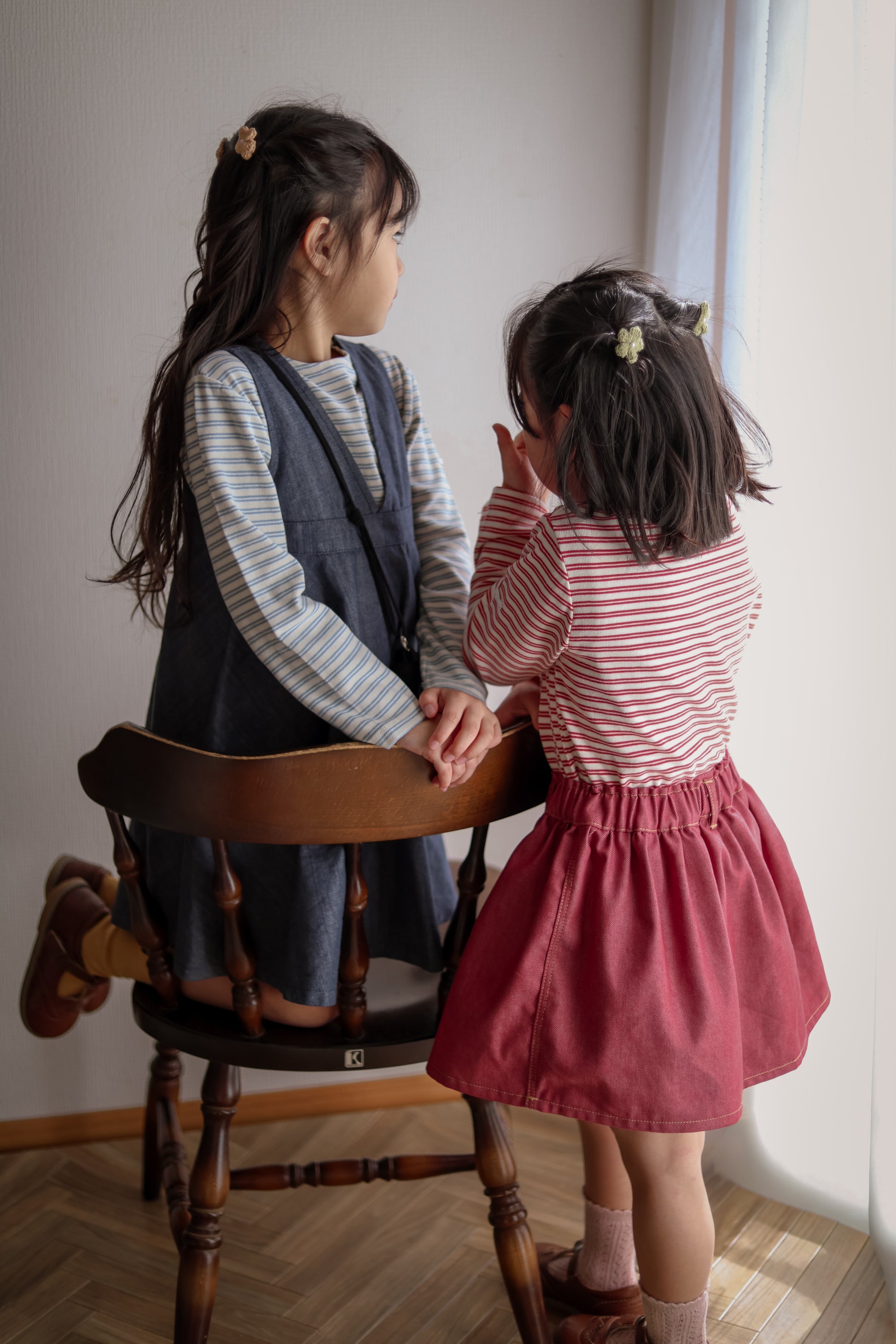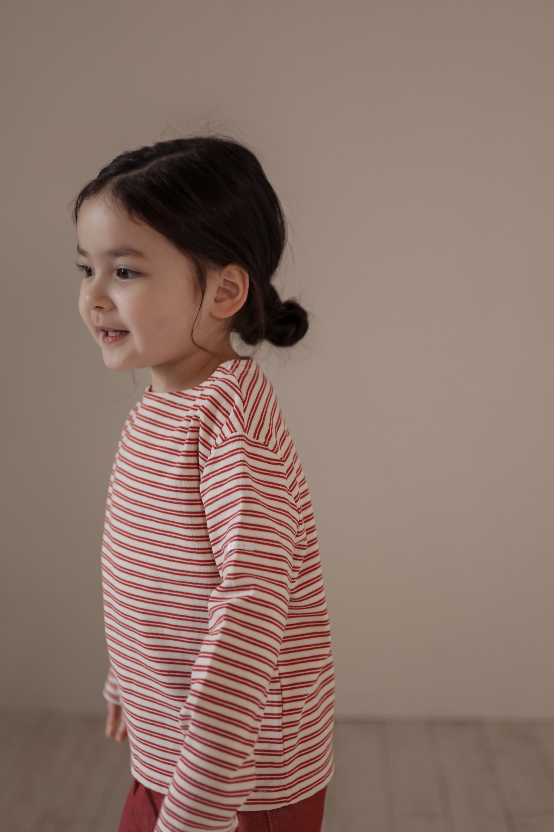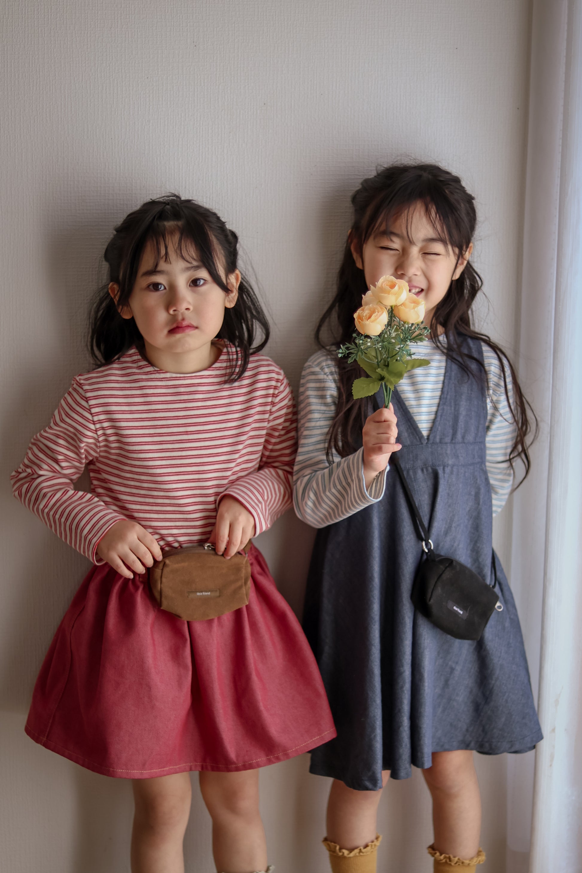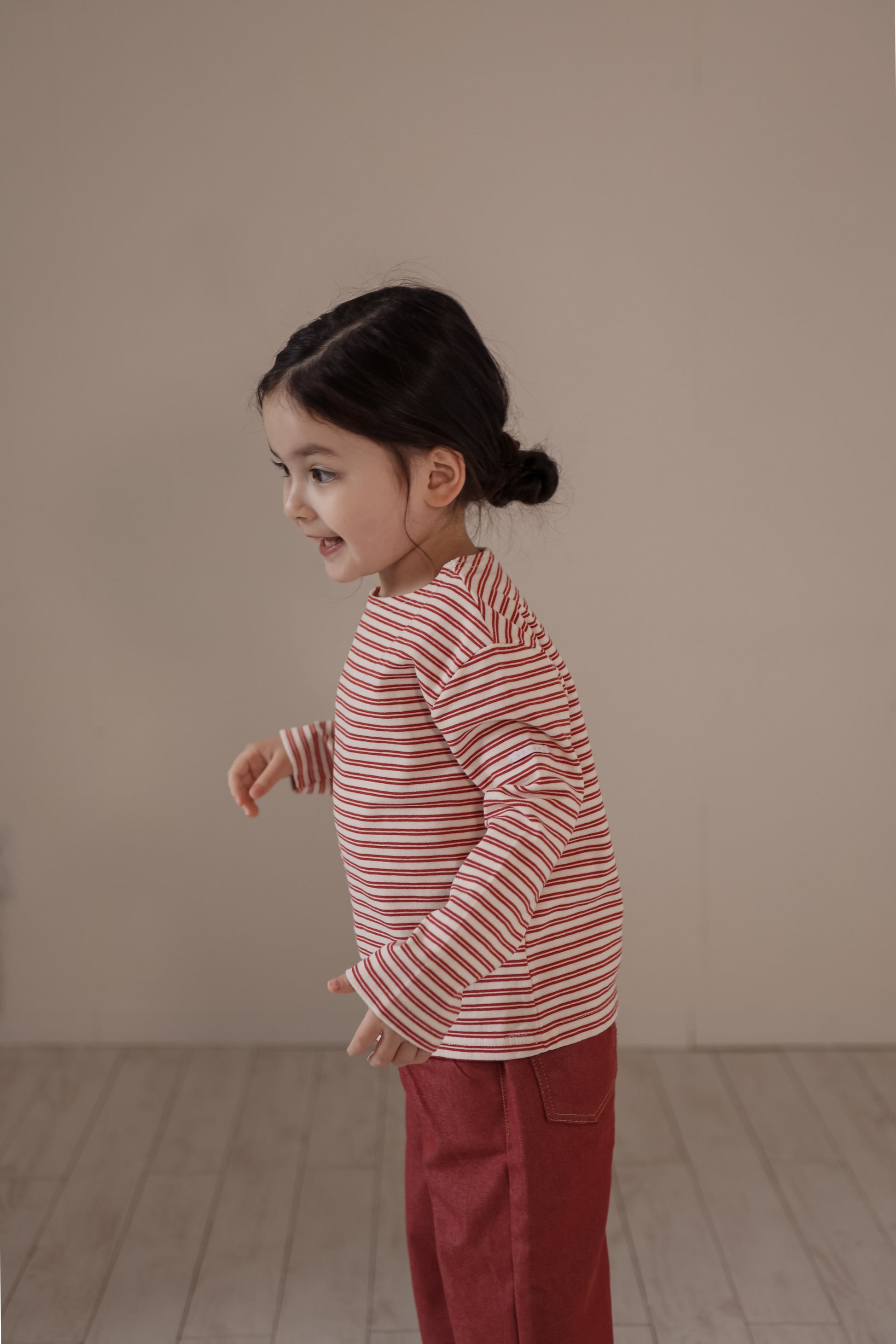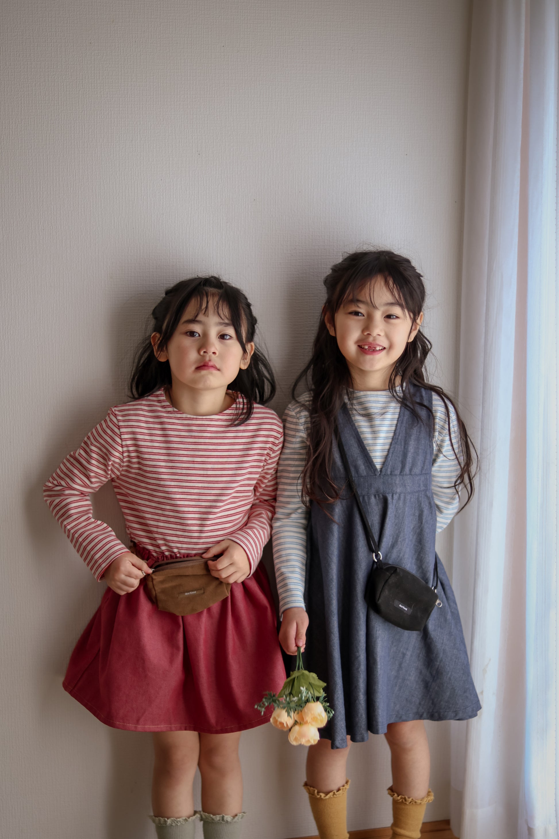 兄妹リンクも可能な、カジュアルすぎないクルーネックのシンプルストライプTシャツ。