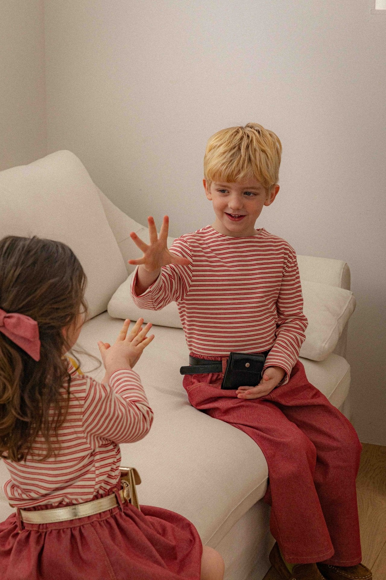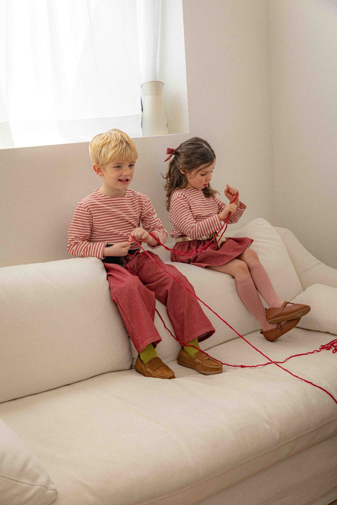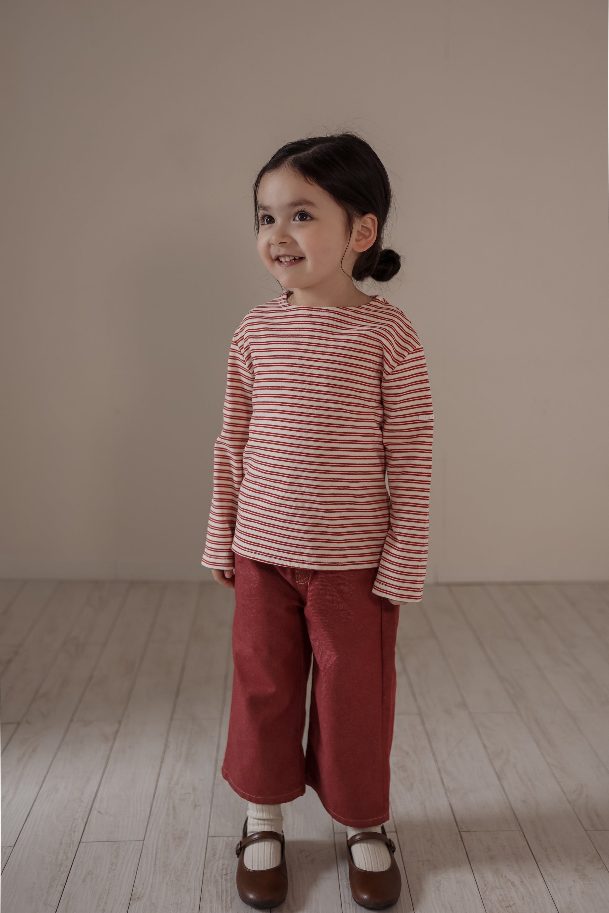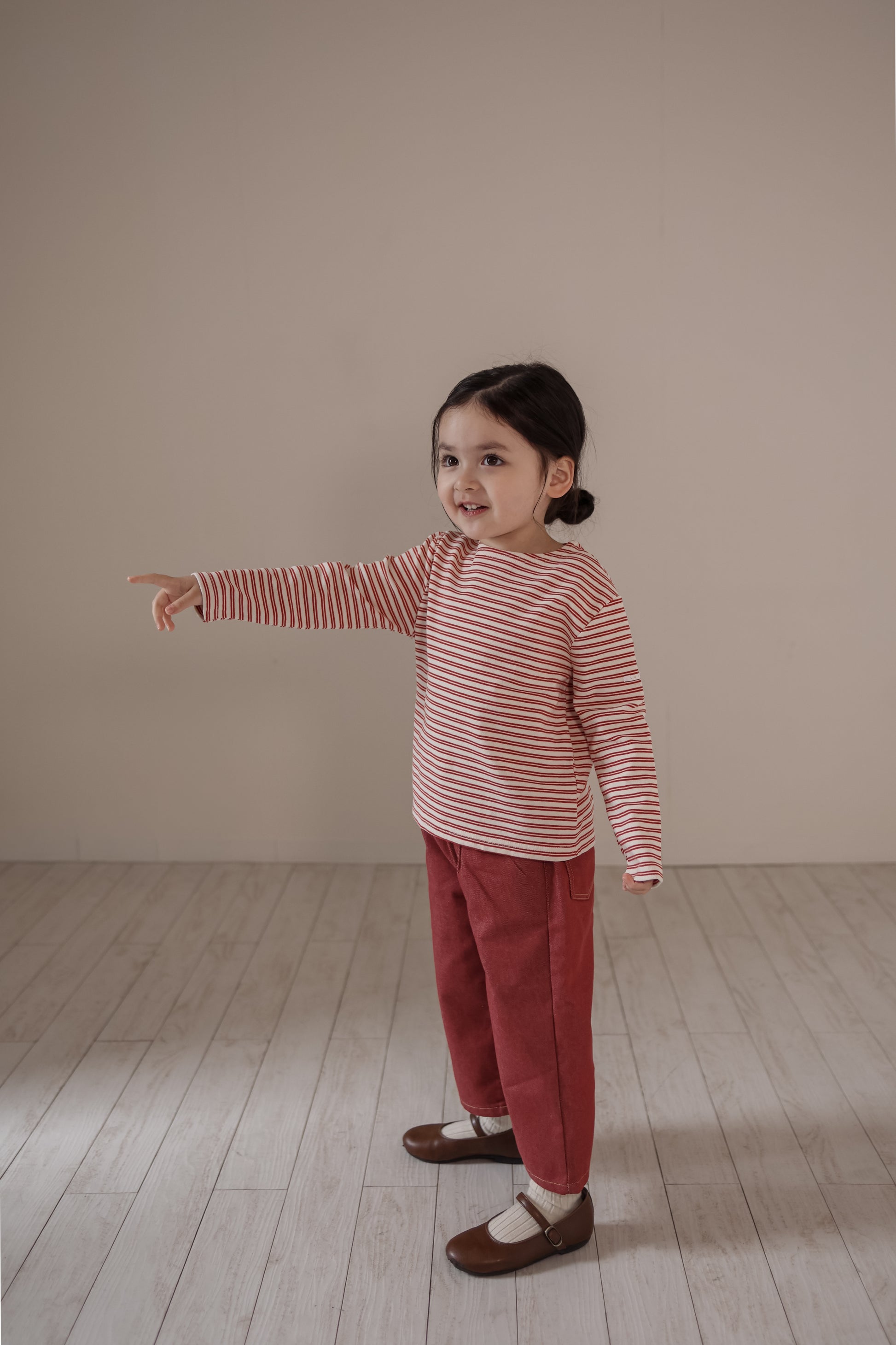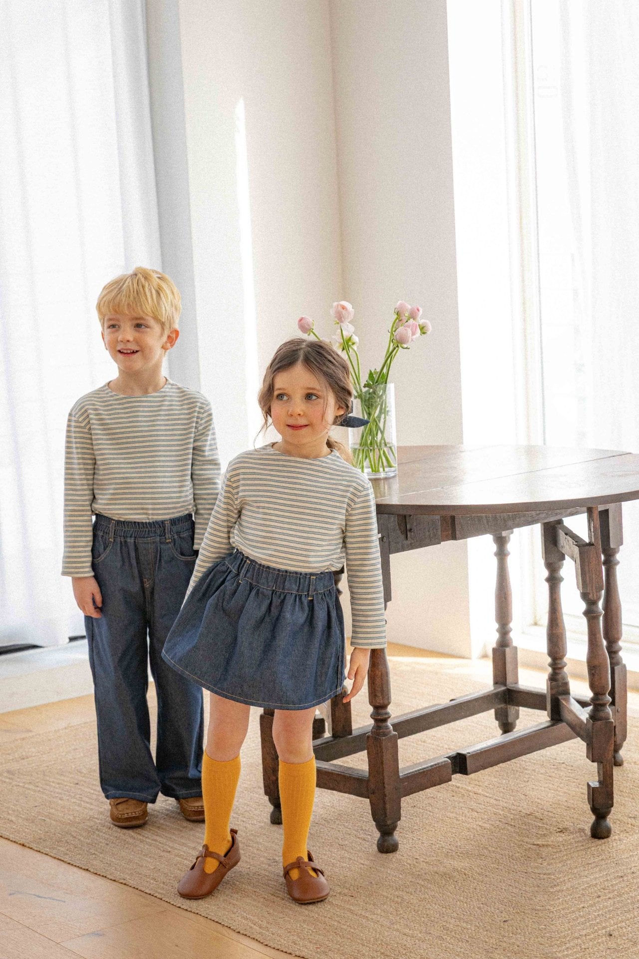 兄妹リンクも可能な、カジュアルすぎないクルーネックのシンプルストライプTシャツ。