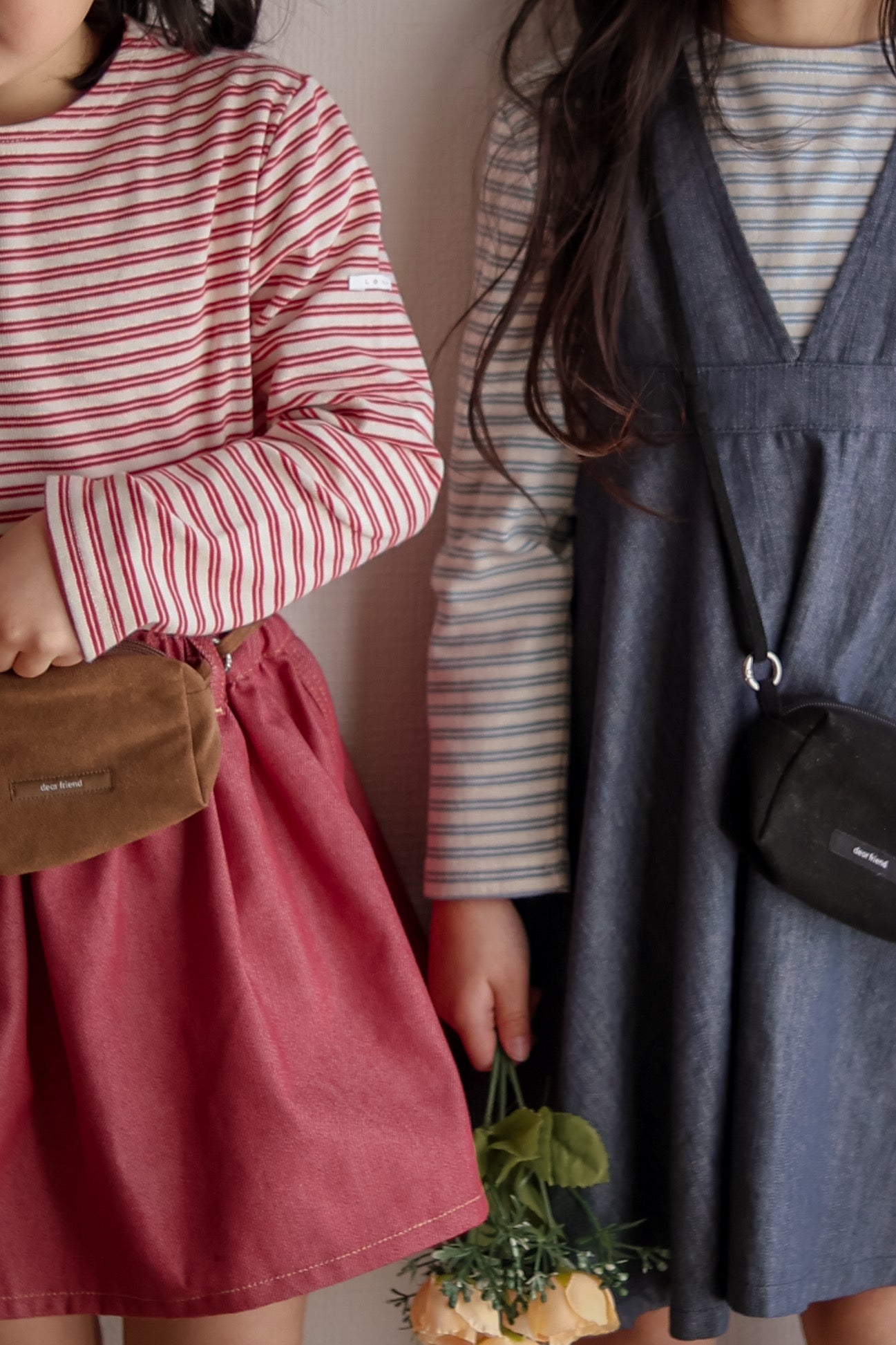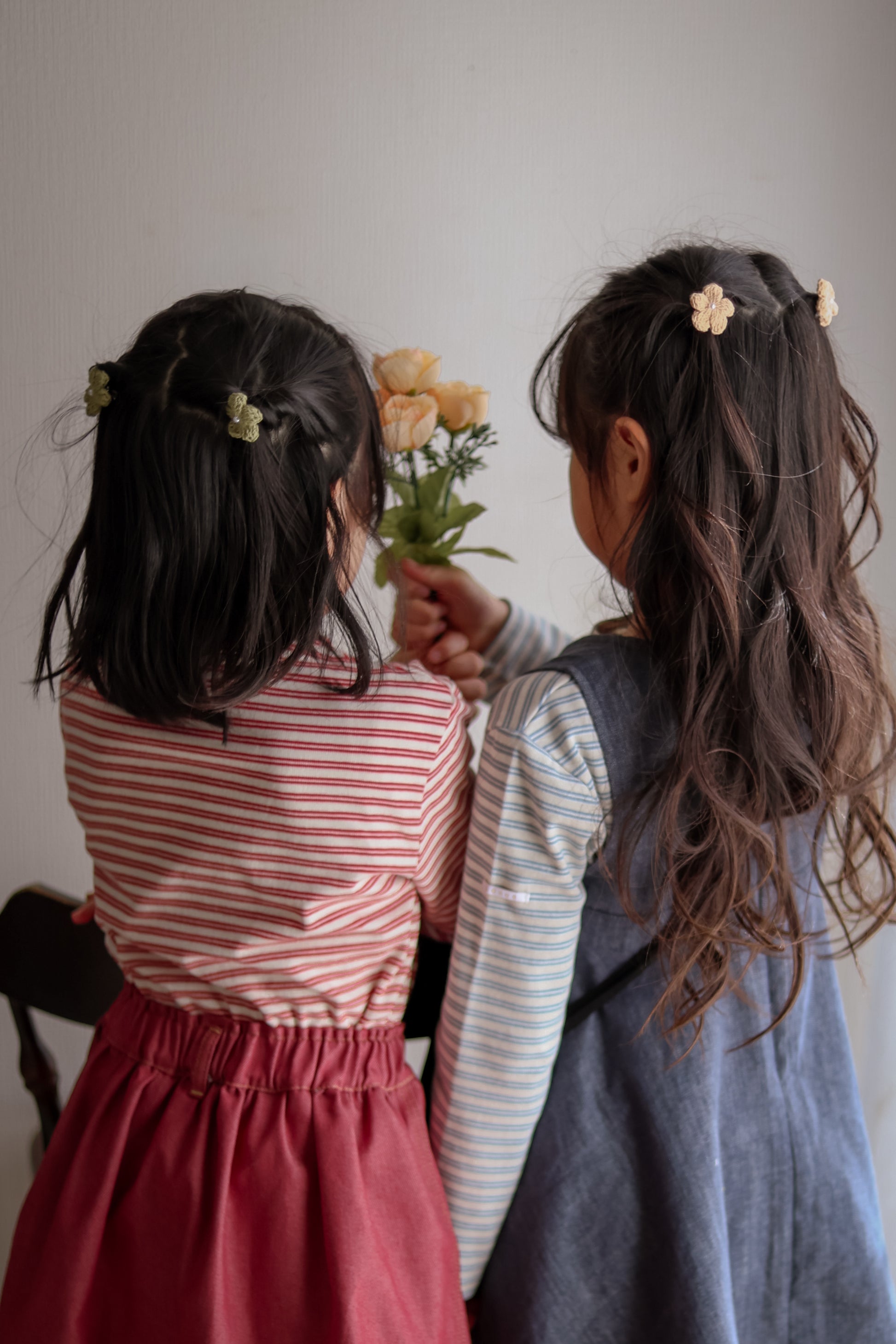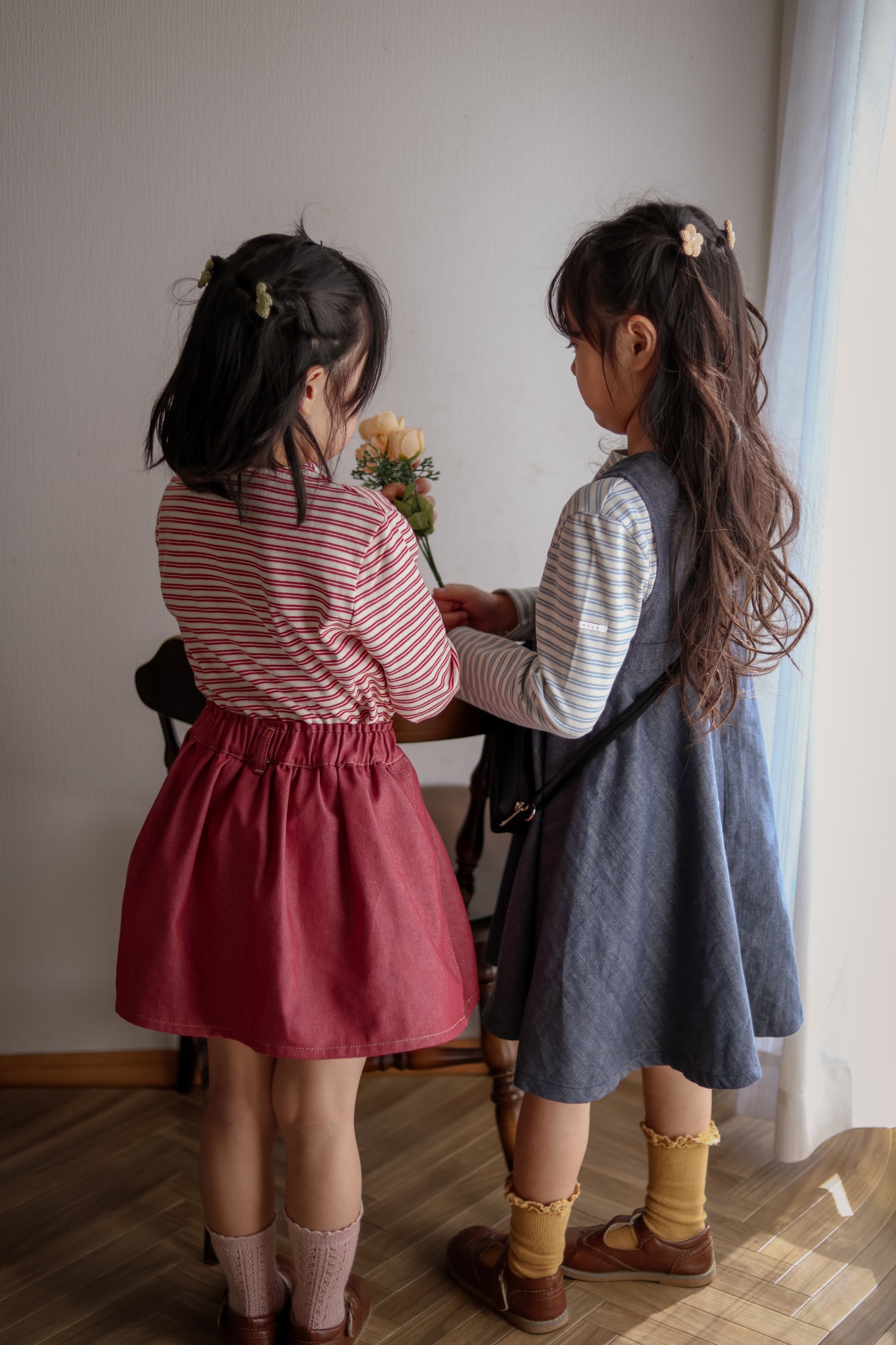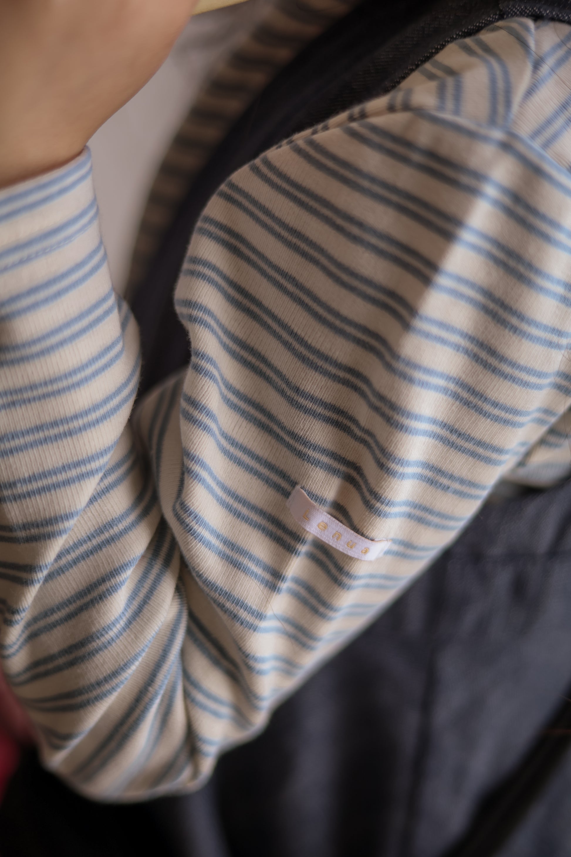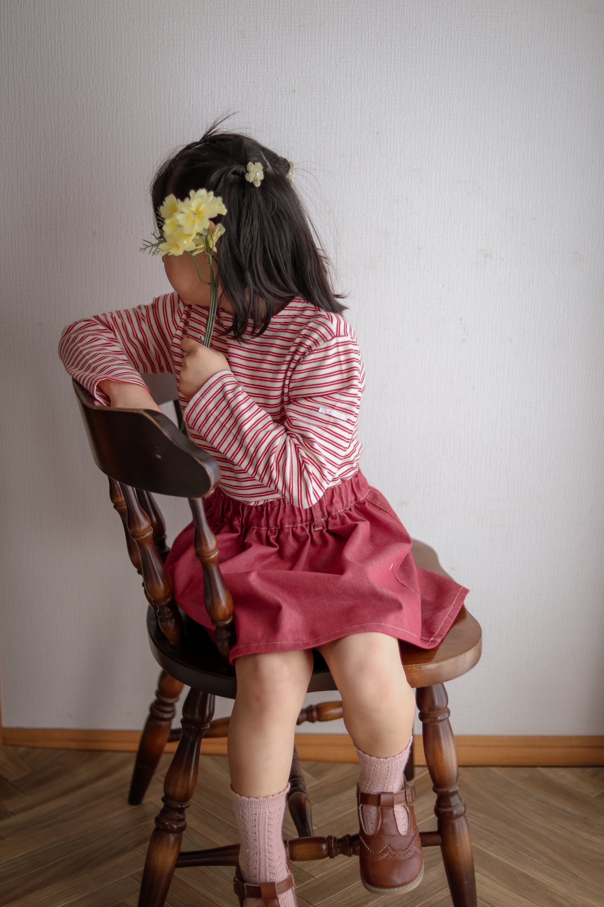 兄妹リンクも可能な、カジュアルすぎないクルーネックのシンプルストライプTシャツ。