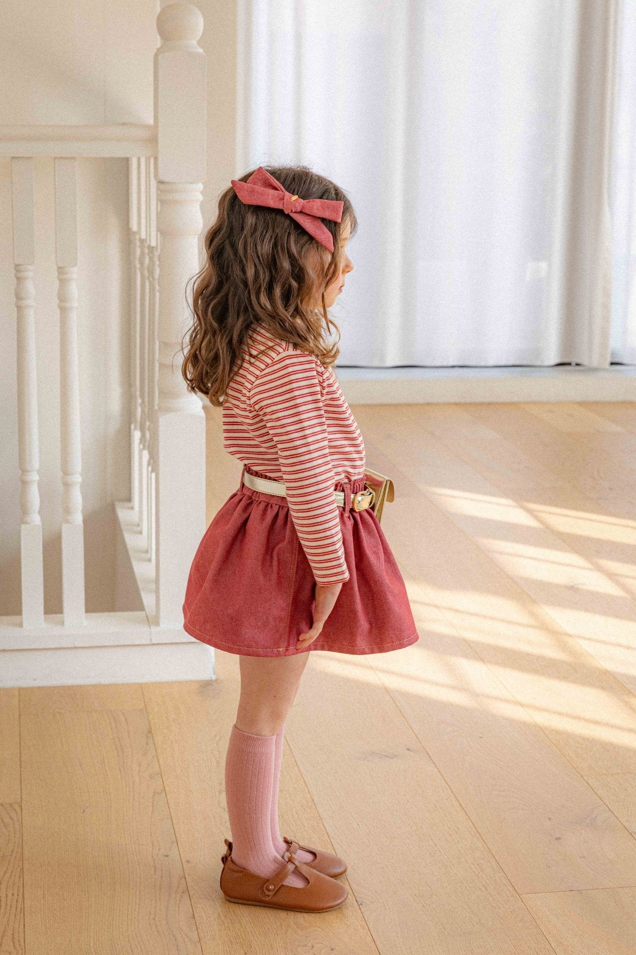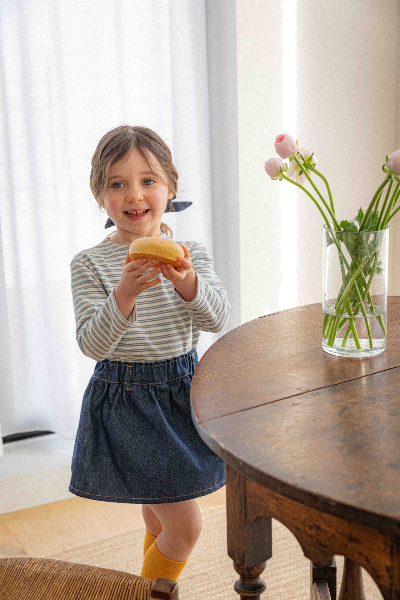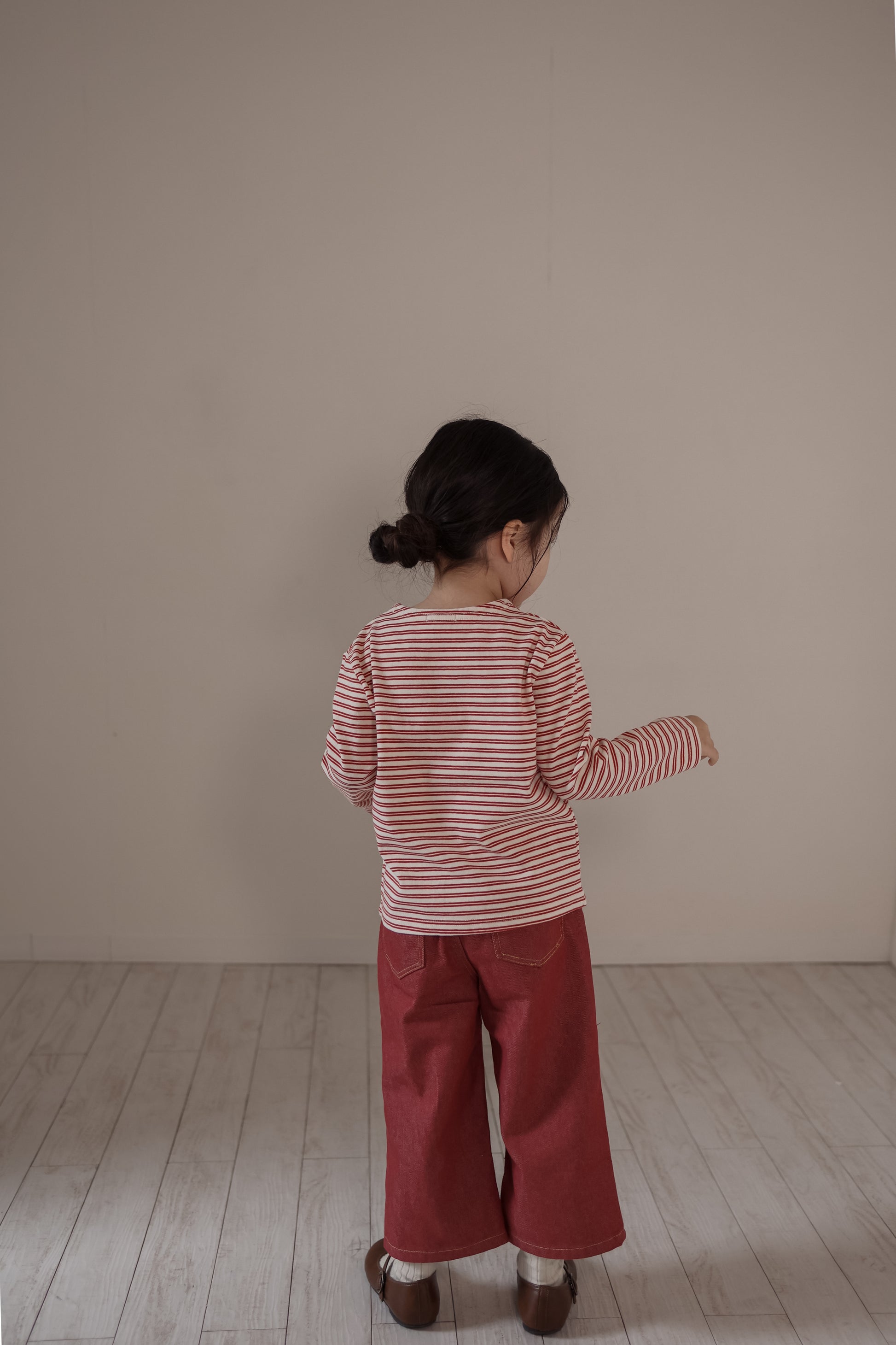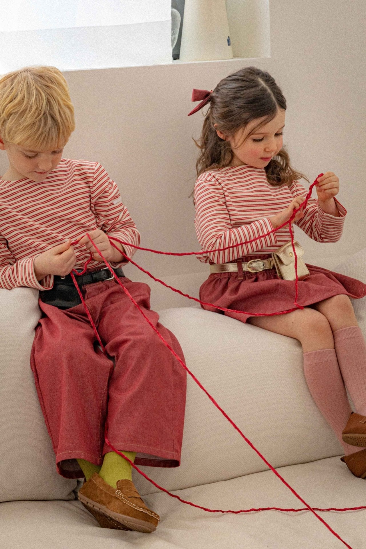兄妹リンクも可能な、カジュアルすぎないクルーネックのシンプルストライプTシャツ。