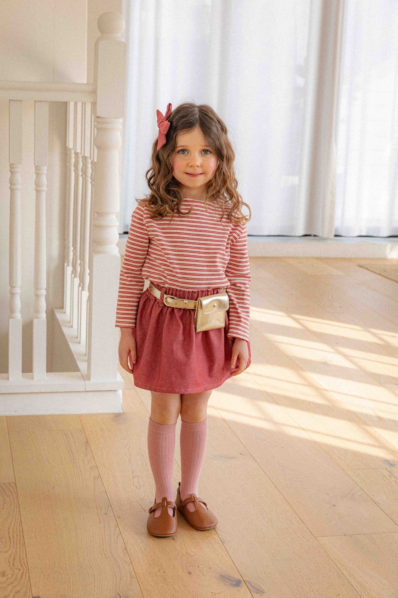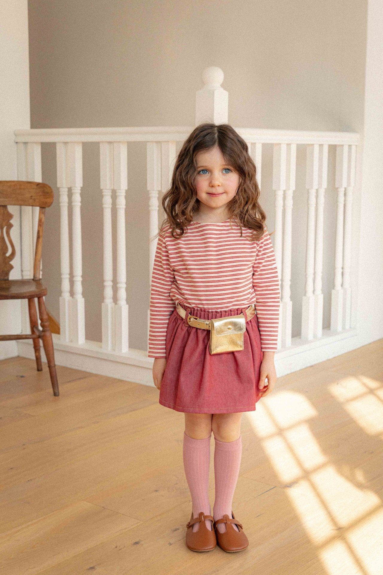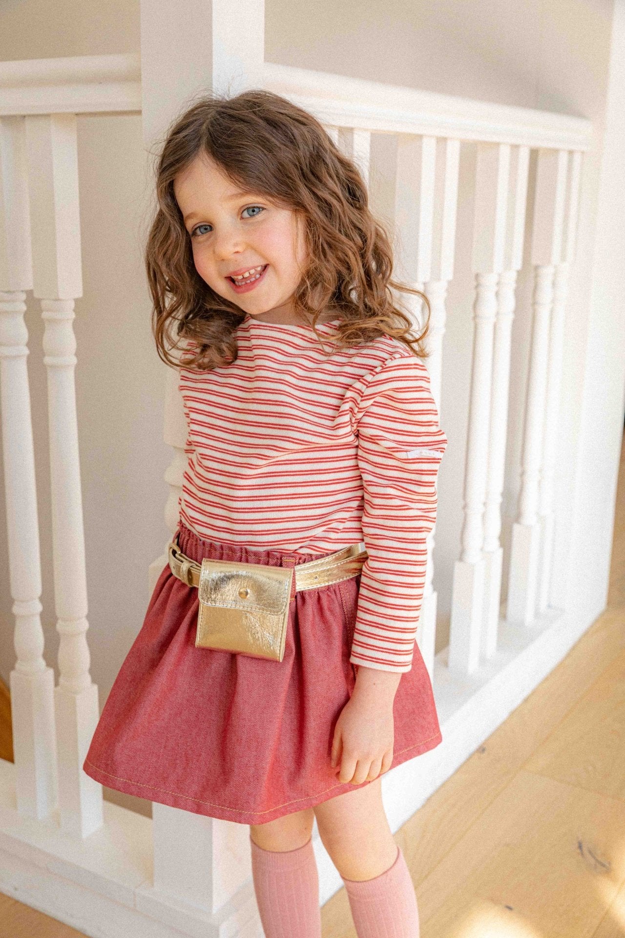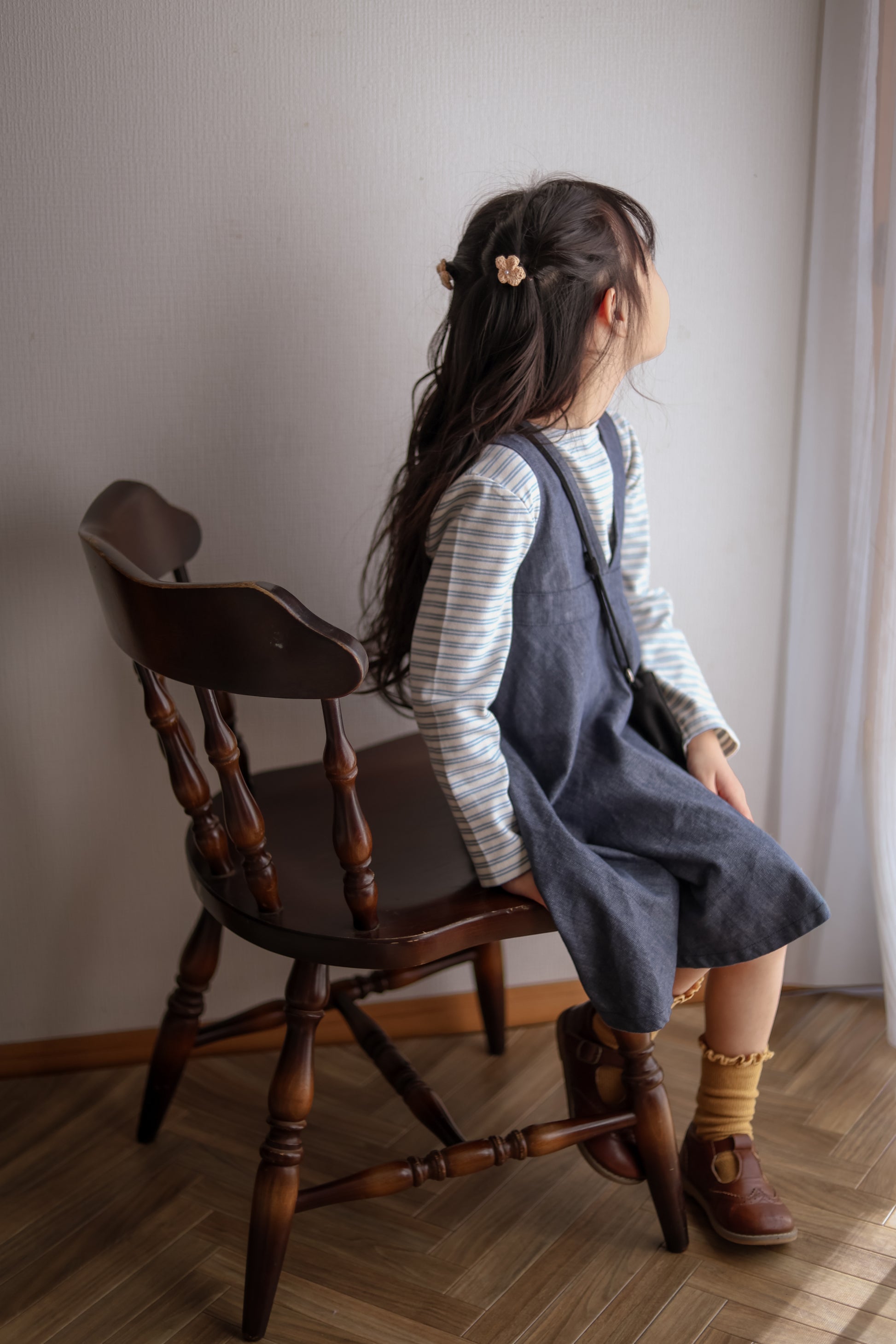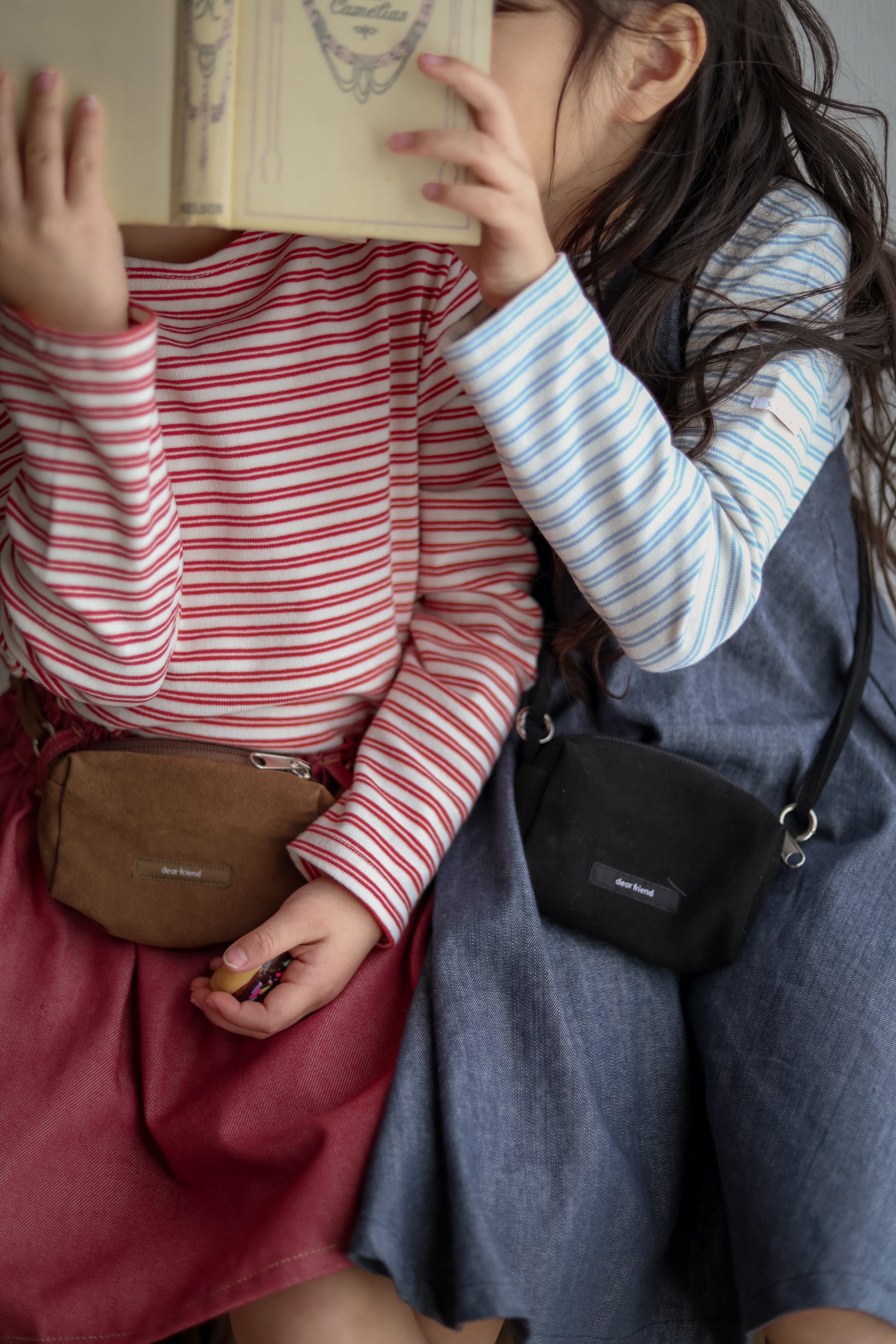 兄妹リンクも可能な、カジュアルすぎないクルーネックのシンプルストライプTシャツ。