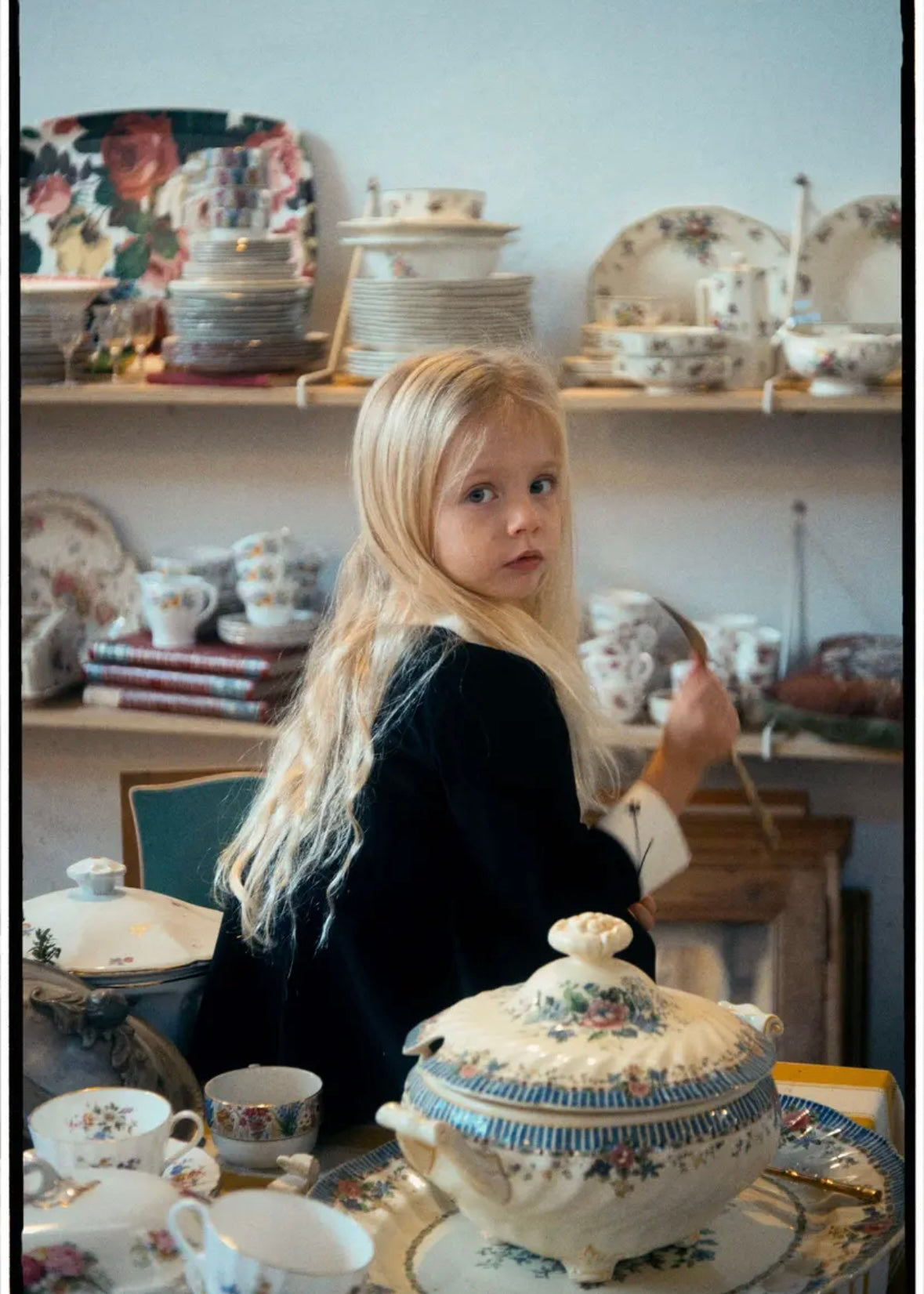 Popelin / Black velvet romper suit with skirt, embroidered collar and placket