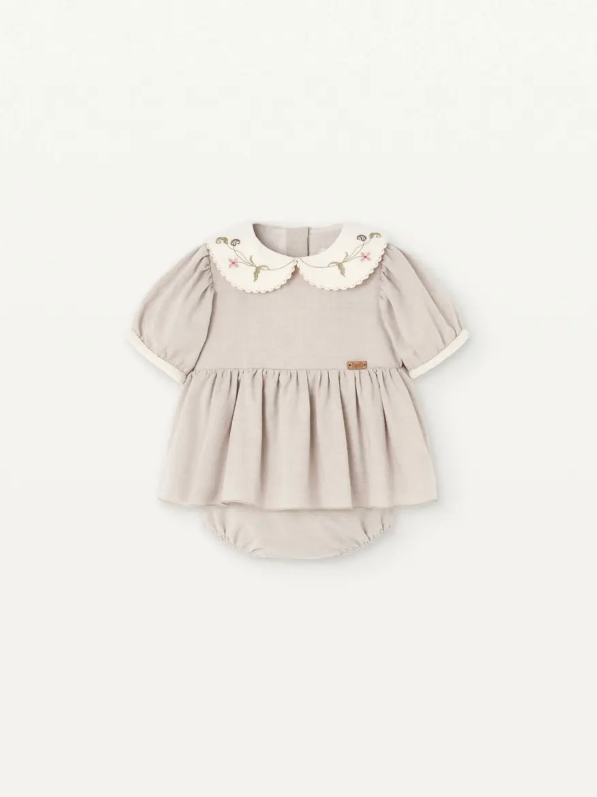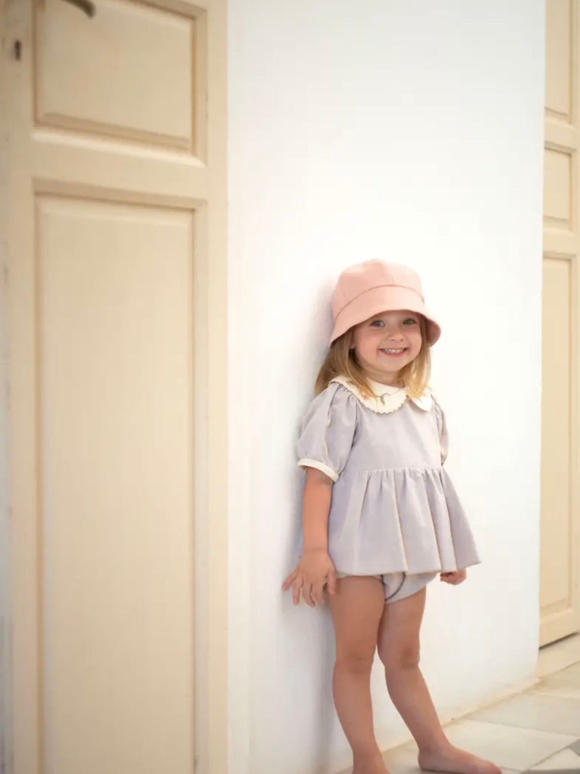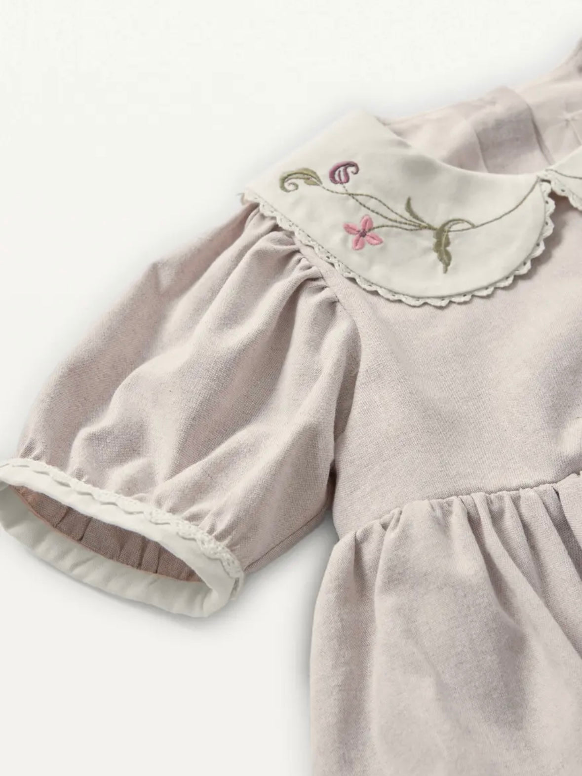 襟は春夏らしいピンクのお花の刺繍とレースで装飾されています。