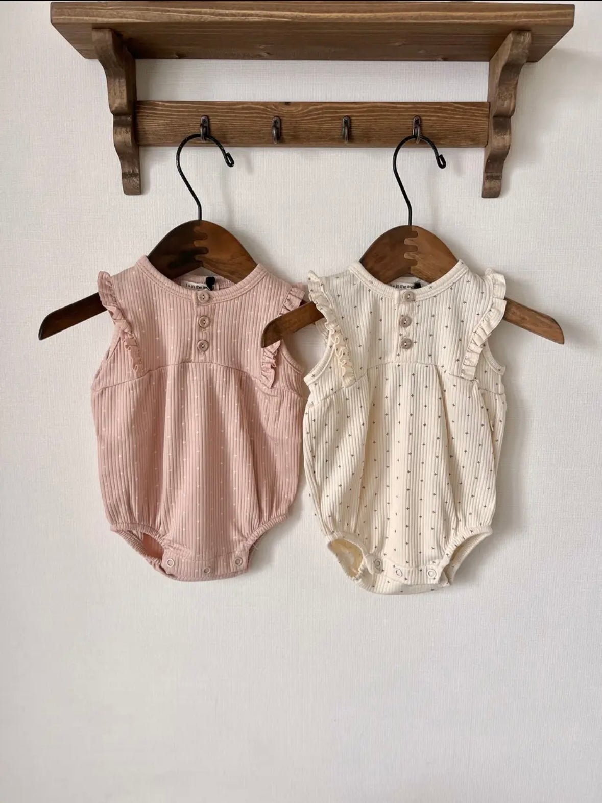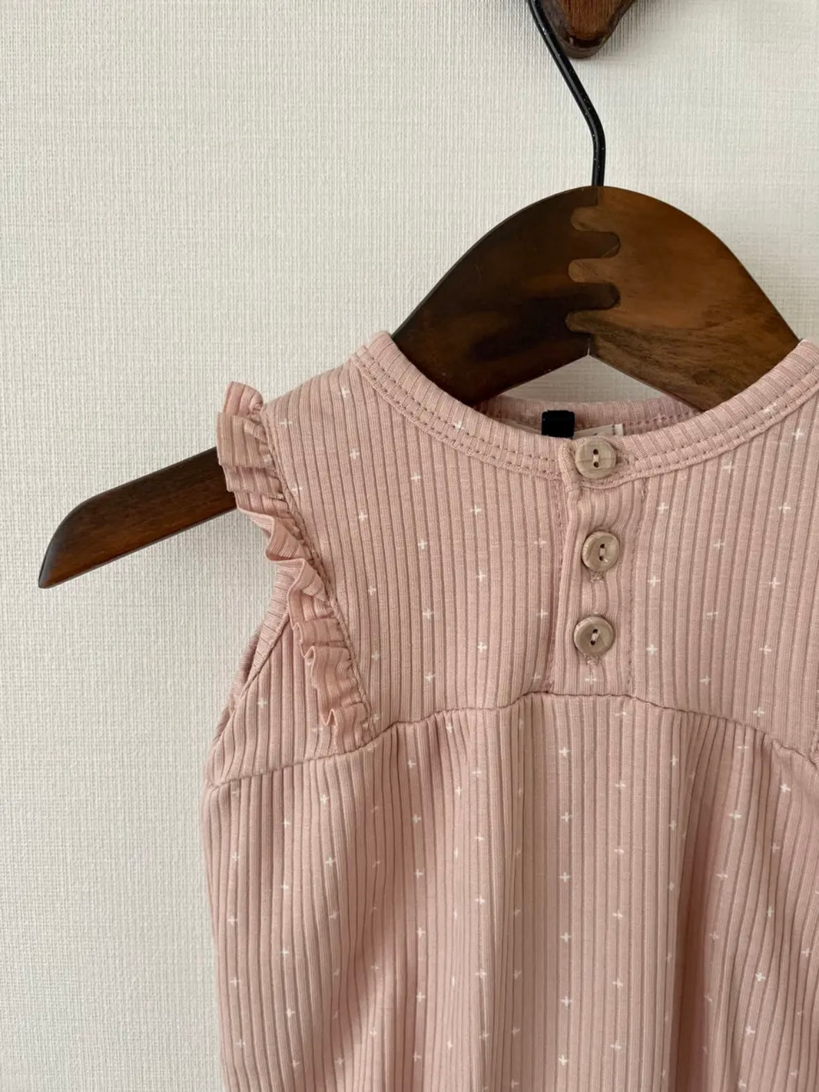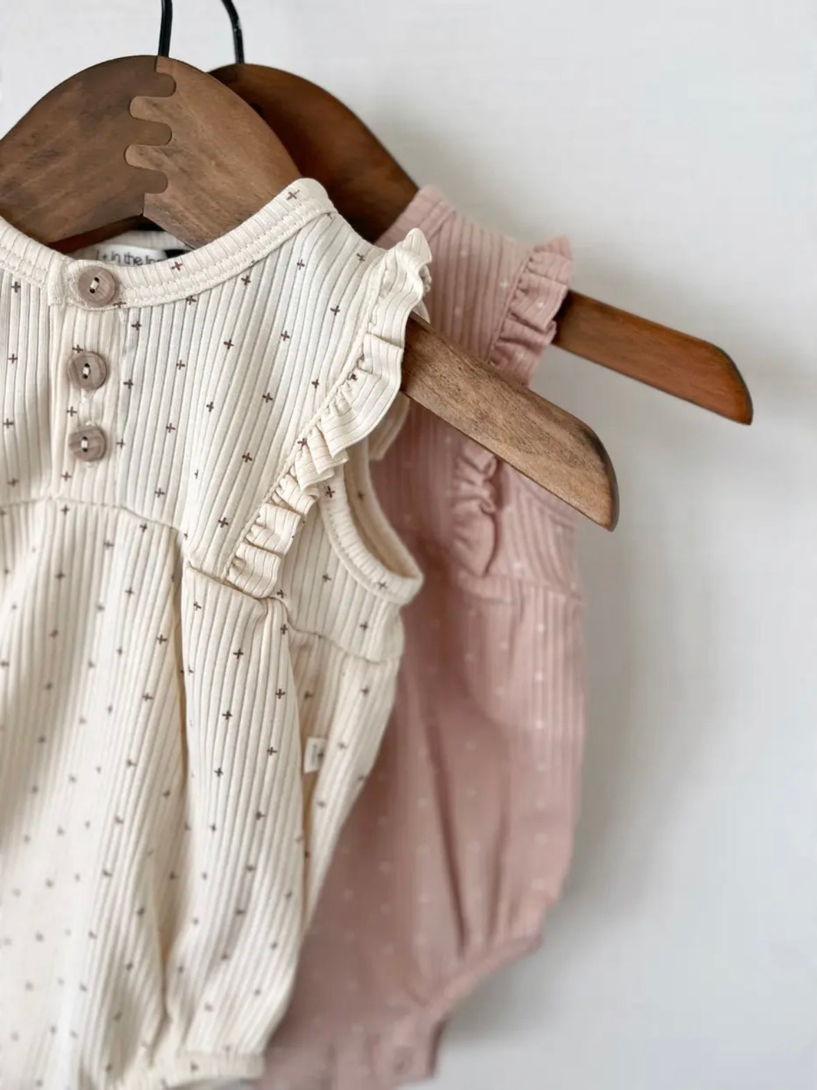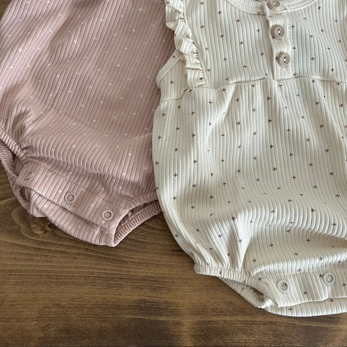 這款連身衣採用柔和的十字點設計。布料觸感柔軟,經久耐穿,且具有出色的體溫調節功能。前部採用開襟設計,肩部飾有荷葉邊,並配有可愛的木質紐帶。無鎳按扣方便更換衣服。