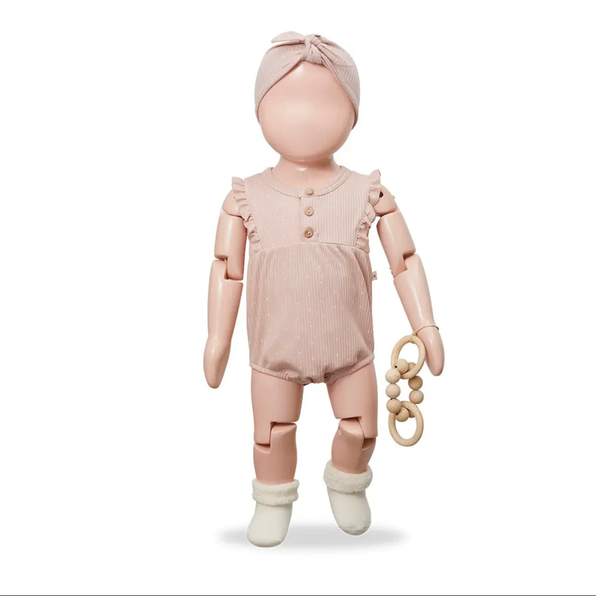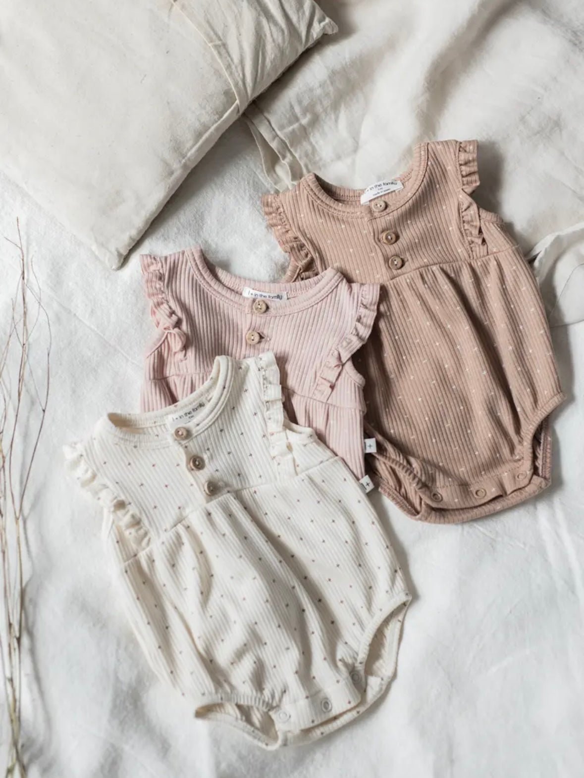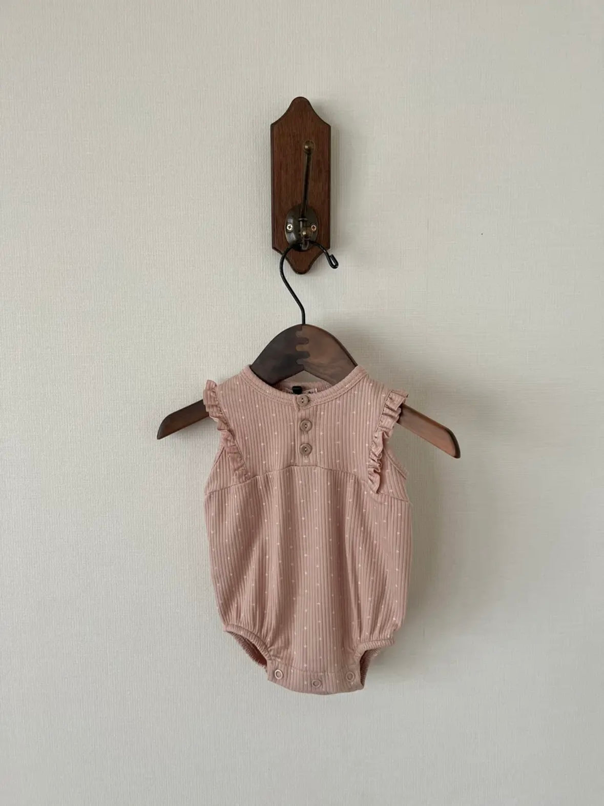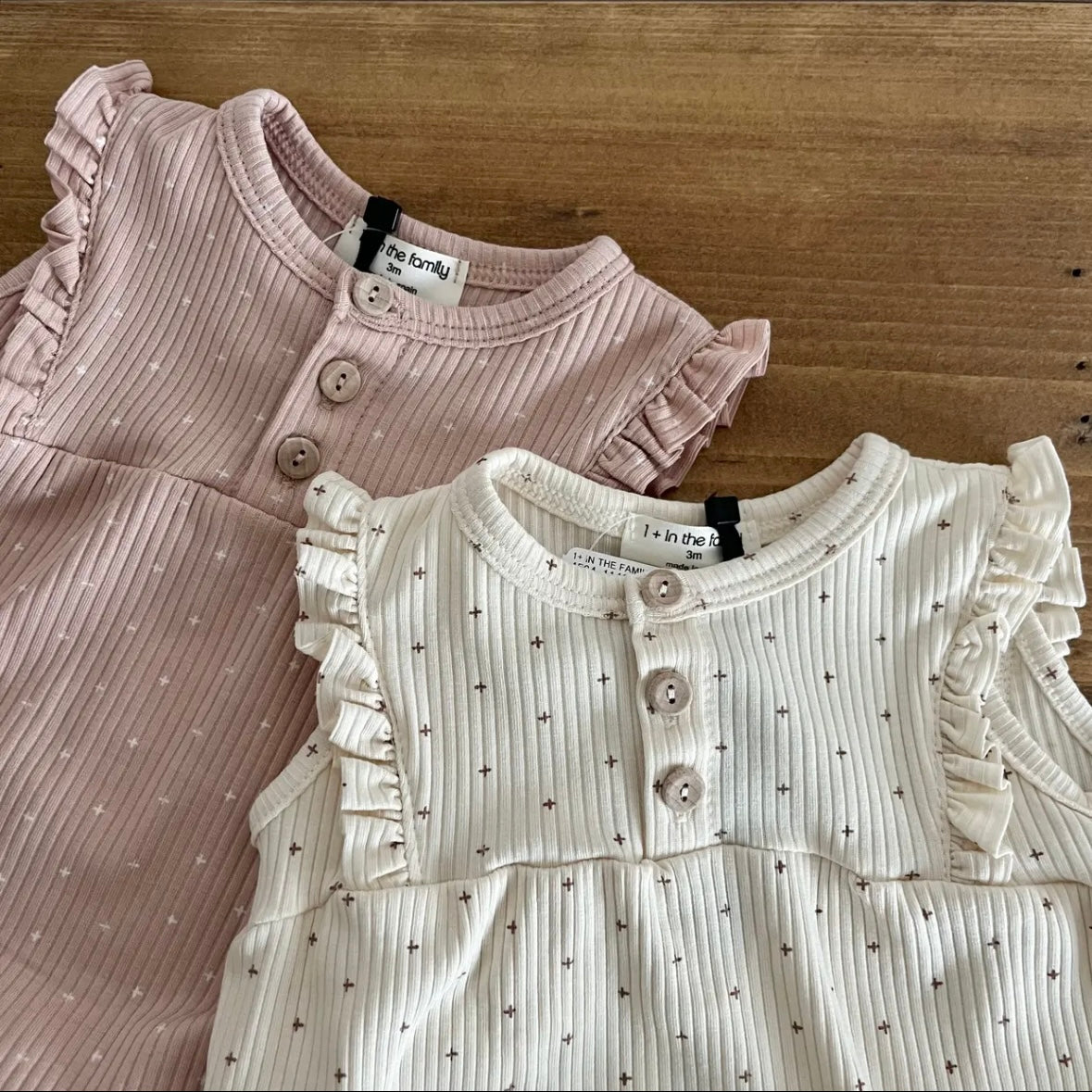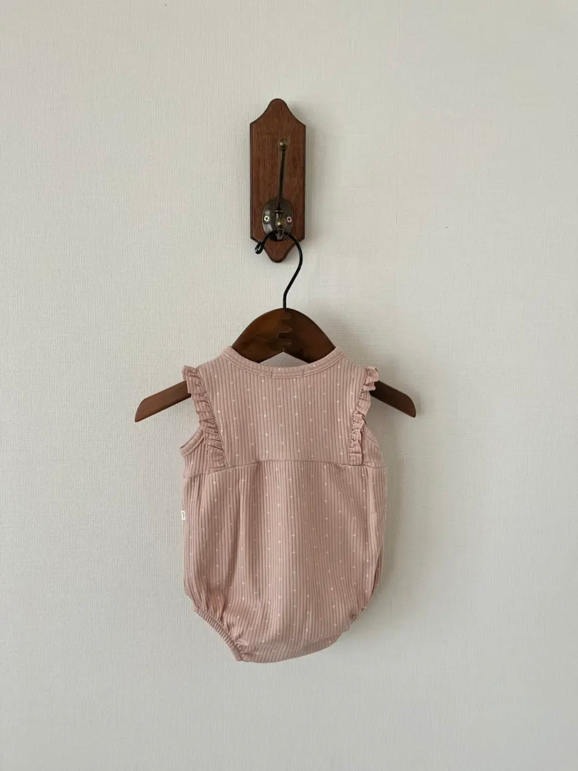 這款連身衣採用柔和的十字點設計。布料觸感柔軟,經久耐穿,且具有出色的體溫調節功能。前部採用開襟設計,肩部飾有荷葉邊,並配有可愛的木質紐帶。無鎳按扣方便更換衣服。