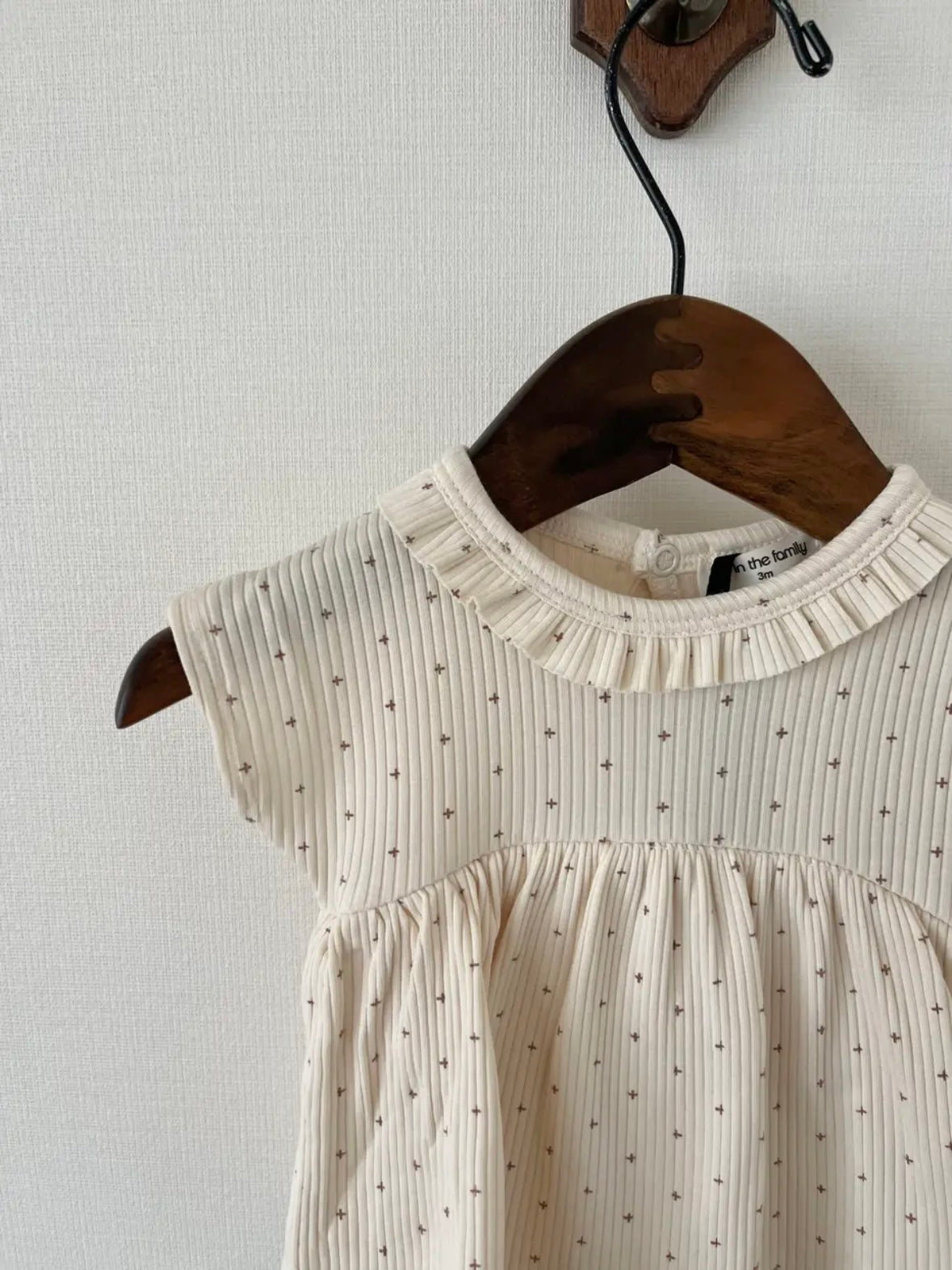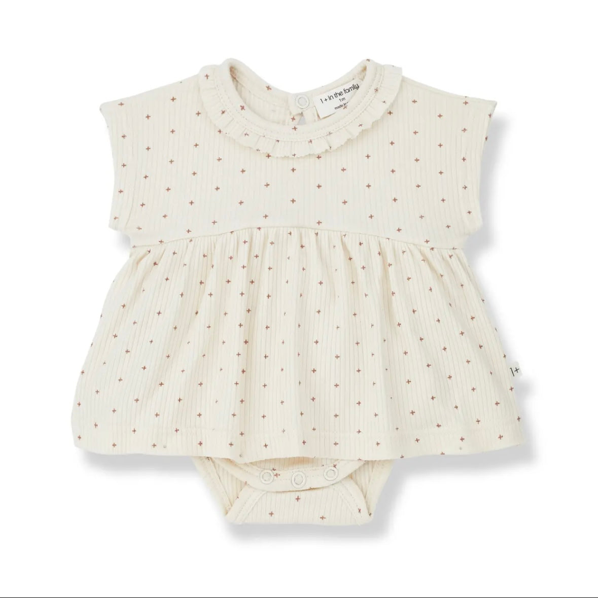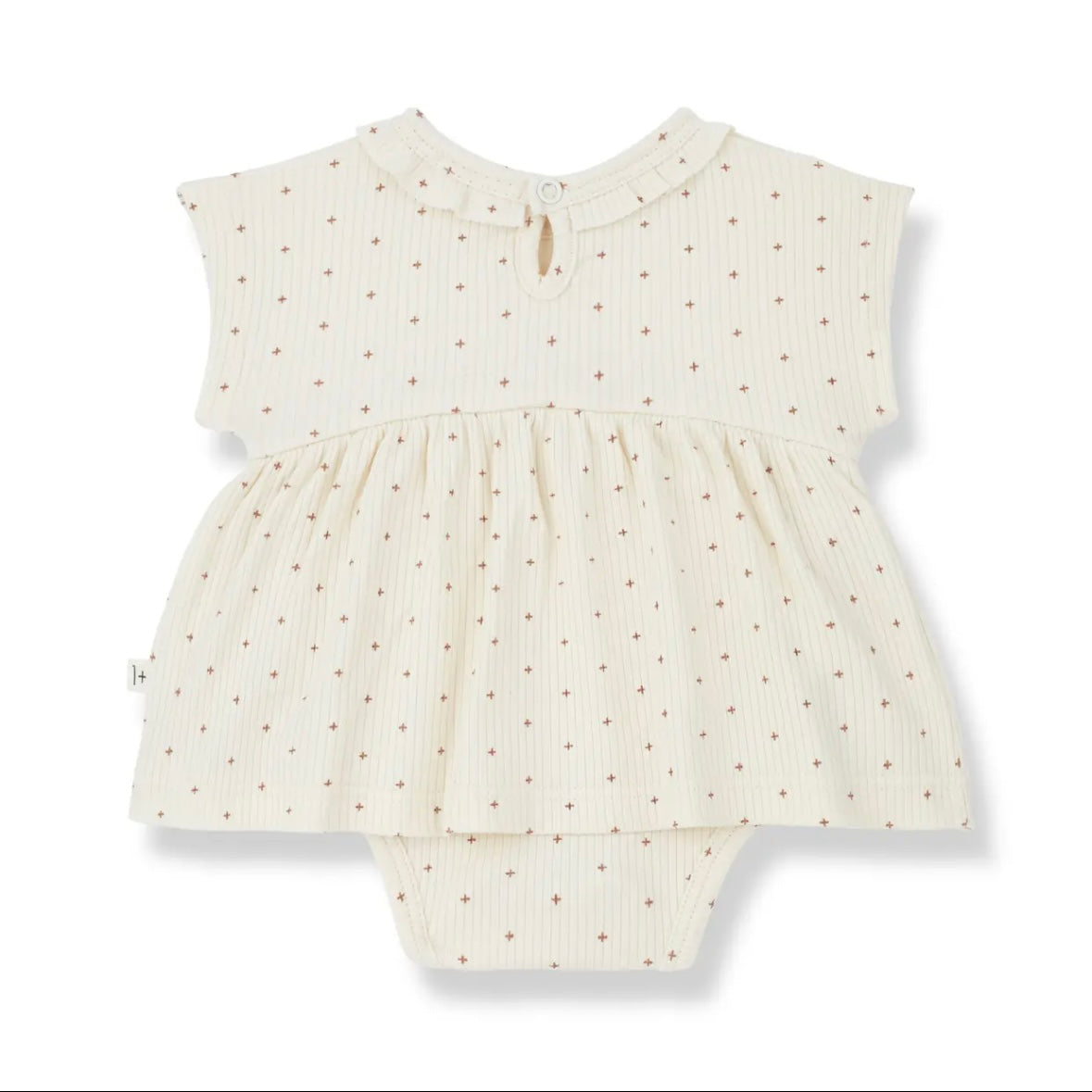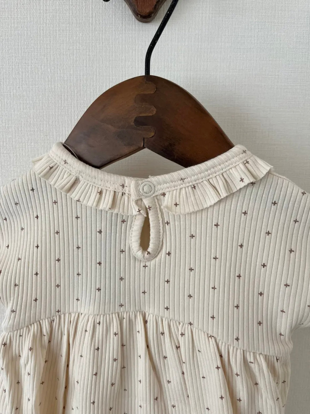 這款連身裙採用柔和的十字點設計。採用柔軟耐穿的布料,具有卓越的體溫調節功能。領口飾有荷葉邊,背面配有按扣。